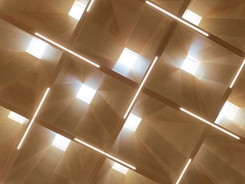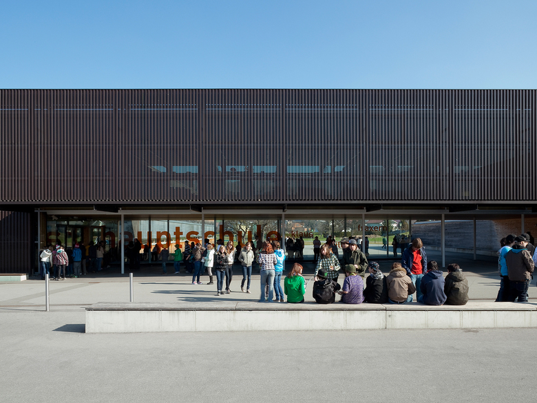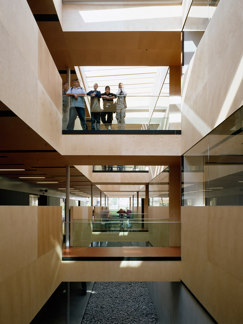 Im Schulgebäude reihen sich die Stammklassen entlang der östlichen und die Fachklassen entlang der westlichen Längsfassade. Dazwischen verlaufen drei parallele Nutzungszonen: in der Mitte ein breiter Gang, rechts ein gebäudehohes Atrium, von den Zugangsbrücken zu den Schulzimmern rhythmisch unterbrochen, und links die Nebenräume. Diese einfache, funktionale Struktur erklärt sich zum einen aus der Logik der Ökonomie, zum anderen aus der durchdachten Tragkonstruktion vorgefertigter Holzelemente.