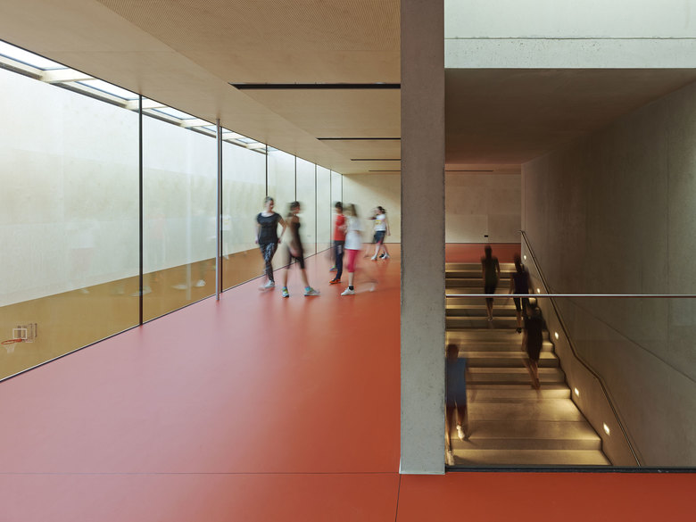 In der Halle schaffen die zweigeschossige Sporthalle und der dreigeschossige Mehrzweckbereich auch Räume für Tagesbetreuung, Vereine und Veranstaltungen. Der fünf Meter hohe Gymnastikraum kann auch für kleinere Veranstaltungen genutzt werden. Darüber befindet sich der Proberaum für den Musikverein. Im südlichen Teil des Gebäudes liegt rund drei Meter unter dem Geländeniveau die große Doppelturnhalle. Nach Westen hin öffnet ein langes Fensterband die Sporthalle zum Vorplatz der Schule und ermöglicht eine gute Sicht auf das tieferliegende Spielgeschehen. Das großzügige Foyer im Erdgeschoss und die Galerie im Obergeschoss bieten Einblick sowohl in die Sporthalle und den Gymnastikraum als auch in das Probelokal.