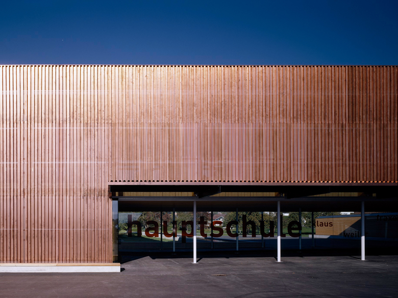 Die neue Hauptschule und der Mehrzwecksaal wurden in zwei Phasen im Abstand von zehn Jahren errichtet. Das Raumkonzept des L-förmigen Gebäudes umfasst drei Hauptfunktionen: Schule, Sporthalle und Bibliothek. Die 2003 fertiggestellte Schule wurde in der Rekordzeit von 18 Monaten in Holzbauweise errichtet und erfüllt als erstes Schulgebäude Österreichs die strengen Passivhausrichtlinien. Zehn Jahre später wurde die stark sanierungsbedürftige Turnhalle durch eine neue Mehrzweckhalle ersetzt. Präzise Planung, die kompakte Organisation des Programms und ein hoher Grad an Vorfertigung ermöglichten eine kurze Bauzeit und optimierte Kosten, ohne Abstriche bei Design und Qualität zu machen.