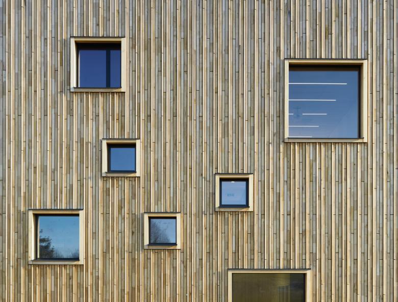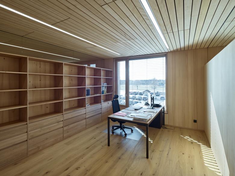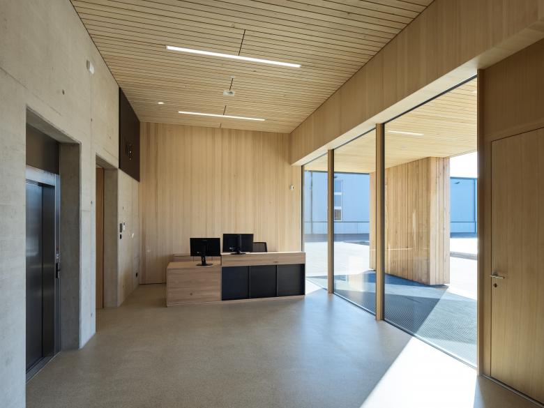 The massive exposed concrete core also forms the support for the prefabricated wood-concrete-composite ceiling elements. The inlaid mineral wool has a sound-absorbing effect and thus improves the acoustics in the building. The ceiling of the uppermost story consists of pure cross laminated timber. The outer walls are made of wood elements and covered with a ventilated, vertical oak formwork.
