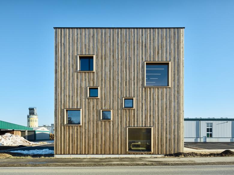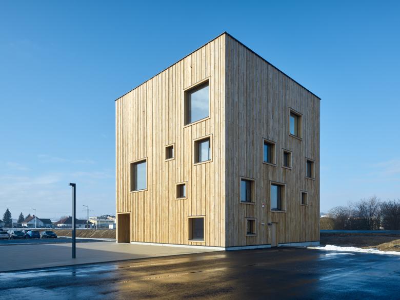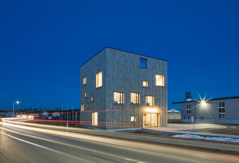 The cubic administration building with its asymmetrically cut windows sets a landmark for the site of the hardwood sawmill Wibeba Holz in Wieselburg. With its eye-catching appearance, the small cube can assert itself against the large neighboring industrial buildings and at the same time blends harmoniously into its environment with loosely built up single-family houses.