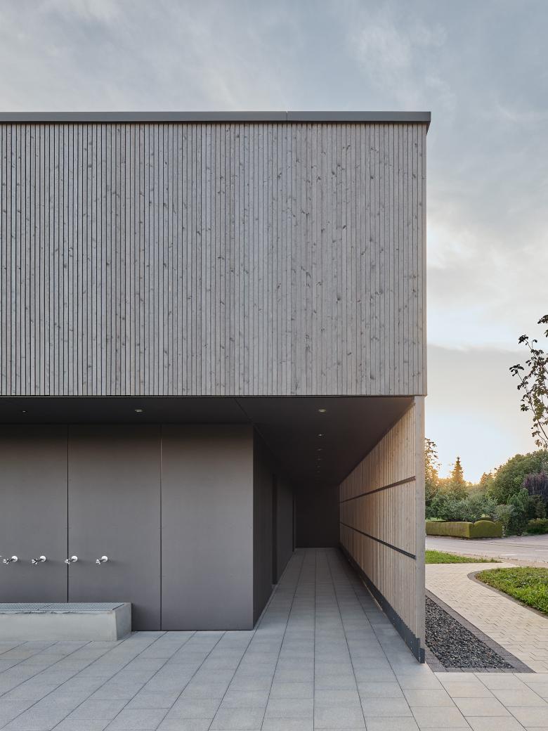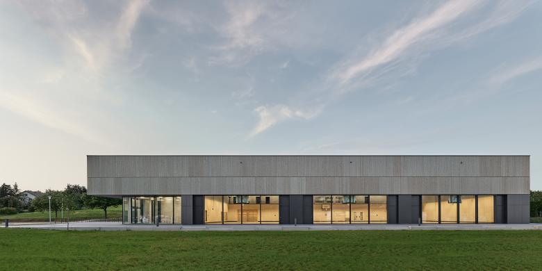 Die Stadt Lauchheim benötigte einen Ersatzneubau für die in die Jahre gekommene Alamannenhalle aus den 60-er Jahren. Die neue Mehrzweckhalle kompensiert durch seine straßennahe Lage den starken Höhenunterschied zwischen Straße und Jagstaue und schafft damit Platz für eine großzügige Fest- und Spielwiese entlang des renaturierten Flussufers. Zentraler Raum für große Veranstaltungen ist die 3-teilbare Halle, die über ein zweigeschossiges Foyer erschlossen wird. Für Veranstaltungen ist eine 80 qm große Klappbühne an der Stirnseite der Halle vorgesehen. Im Innenraum dominieren die Eigenfarben von Sichtbeton in Glatt- und Brettschalung als robuste langlebige Oberfläche in Kombination mit hell lasierten Fichteholzpaneelen. Der durchgängig schwarz gehaltene Linoleumboden wird außen mit dunklem Betonpflaster weitergeführt und verbindet somit den Innen- mit dem Außenraum. Die reduzierte Farbwahl eignet sich sowohl für Sport- als auch für Veranstaltungsnutzung.