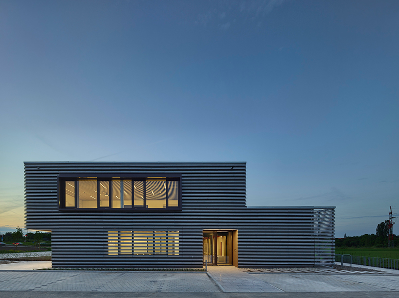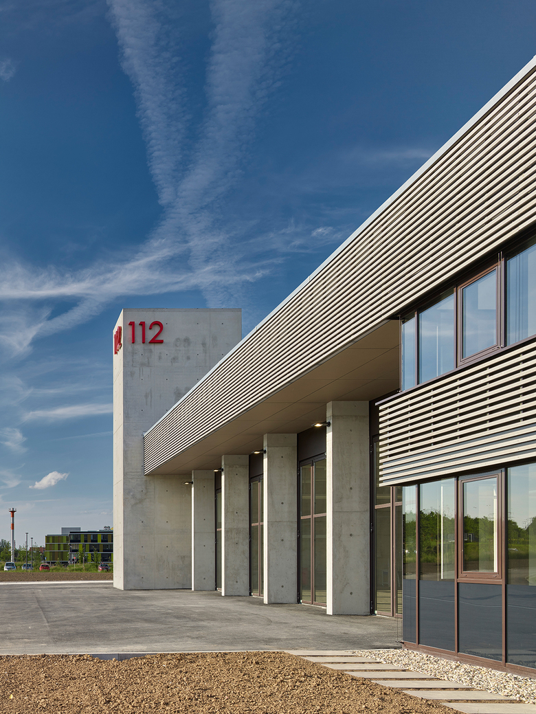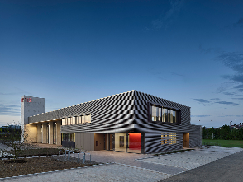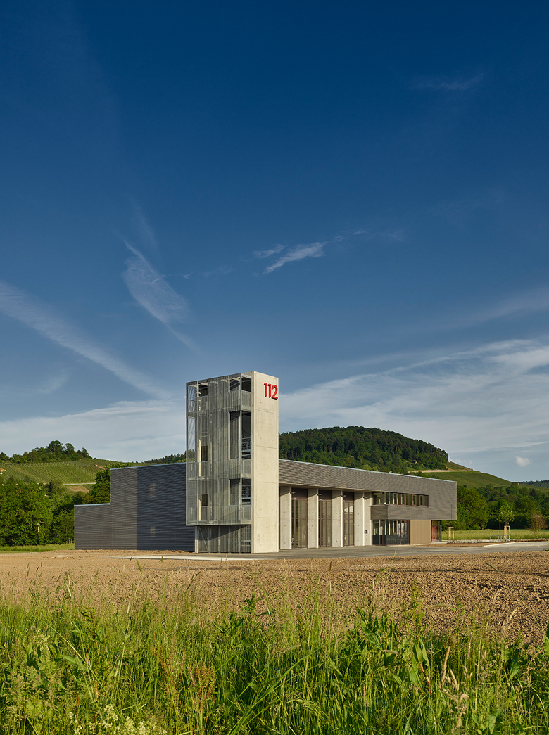 Auf freiem Feld am Rand eines Teilorts von Winnenden war ein neues Feuerwehrhaus zu planen, das optimale Betriebsabläufe im Innenbereich wie auch im Außenbereich für die Zu- und Abfahrten mit zwei Anbindungen an die Landesstraße schafft. An einer Wagenhalle für 4 Einsatzfahrzeuge liegen im Erdgeschoss Geräteräume, Umkleiden, Bereitschaftsraum und Funkraum, im Obergeschoss ein Verwaltungs- und ein großer Schulungsraum. Der 13 m hohe Übungsturm als kleine Dominante und Symbol für den Gebäudeinhalt schließt den Baukörper nach Norden ab. Die Fassaden sind horizontal mit farbig lasierten Latten aus Lärchenholz verkleidet, der Eingangsbereich wird mit Faserzementplatten betont. Der Übungsturm setzt sich aus drei Sichtbetonwänden zusammen, in die eine Gitterrosttreppe eingestellt ist, von der die Übungsbalkone auskragen.