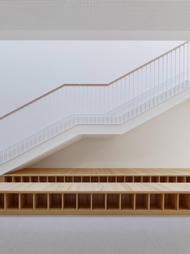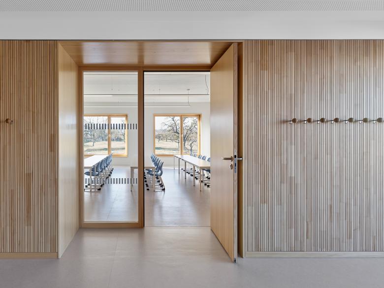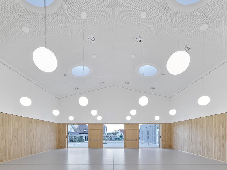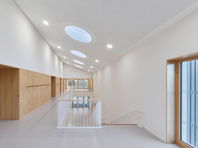 Im Herrenberger Stadtteil Haslach entstand zwischen Wohnhäusern, Streuobstwiesen und in direkter Nachbarschaft zu einem Kindergarten ein zweigeschossiger Neubau, der drei unterschiedliche Nutzungen beherbergt: Den Ersatzneubau der Grundschule Haslach, die Erweiterung des benachbarten Kindergartens und einen Mehrzweckraum. Gemäß dem Prinzip ‚Drei Nutzungen, drei Häuser’ lassen sich die Nutzungsbereiche auch baukörperlich ablesen. Die gewählte Giebeldachform unterstützt diese Gliederung und nimmt zusätzlich die Maßstäblichkeit und Dachform der umgebenden Wohnbebauung auf. Das holzverkleidete Gebäudeensemble bildet nach Norden und Westen klare Raumkanten und umschließt den geschützten Freibereich, der als Schulhof dient. Das Herz des Schulbaukörpers bildet eine zweigeschossige, lichtdurchflutete Halle mit einer offenen Verbindungstreppe in den Unterrichtsbereich. Tagesbelichtete Fluraufweitungen dienen als offene Lernzonen und Aufenthaltsbereiche, die zum Austausch der Schüler untereinander anregen sollen.