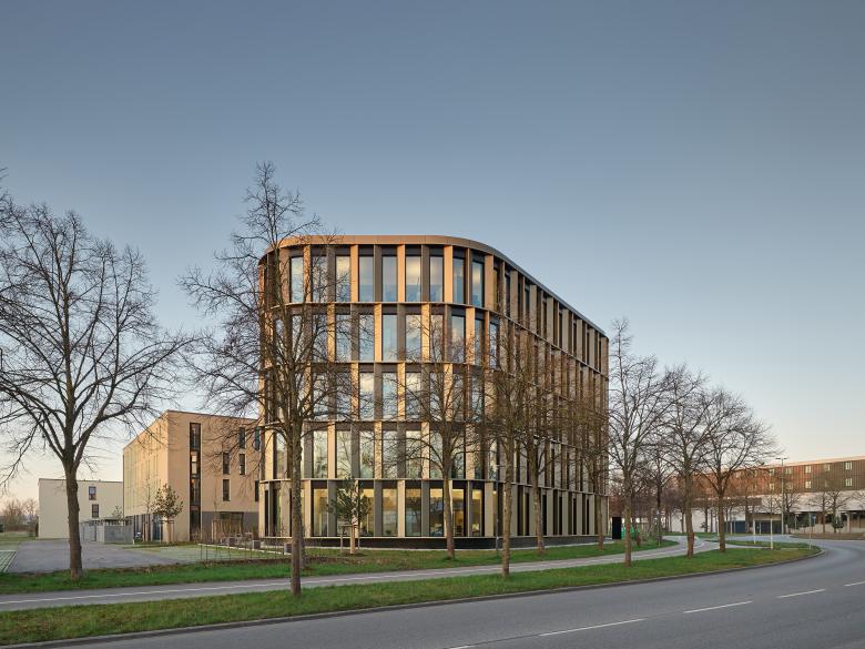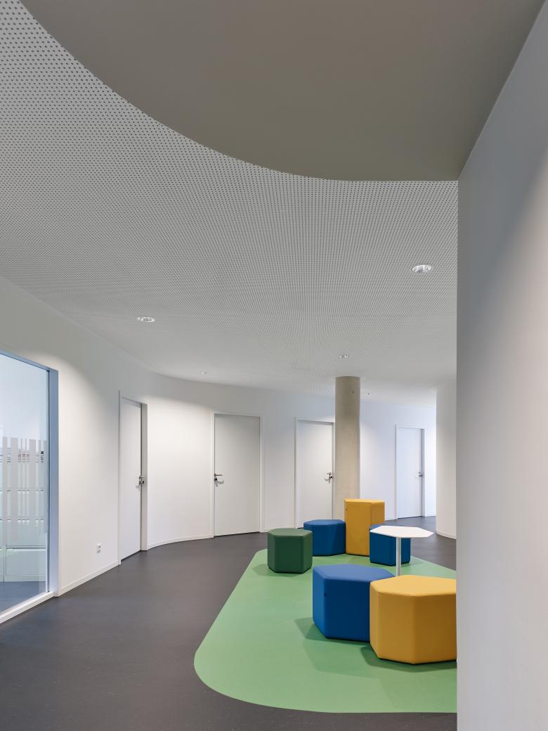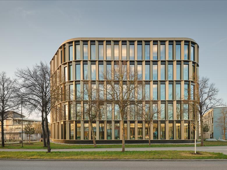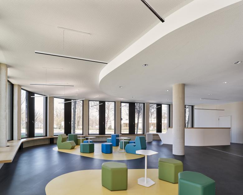 In seinem neuen Domizil nahe dem Uni-Campus bündelt das Studierendenwerk Augsburg alle Abteilungen und bietet eine zentrale Anlaufstelle für die Anliegen der Studierenden – von juristischer Beratung, über BAFöG bis Wohnheimplatz. Mit der stark profilierten Metall-Glas-Fassade und den abgerundeten Kanten auf einem Fünfeck-Grundriss gibt sich das ungerichtete Gebäude klar als Sonderbau zu erkennen und wirkt als Identitätsträger für das ganze Quartier. Der hohe Fensteranteil, der daraus resultierende offene Charakter, die helle Farbigkeit und die weichen Formen entsprechen dem Wunsch des Bauherrn nach einem kommunikativen Haus, das für Mitarbeiter wie Besucher gleichermaßen ein angenehmes Umfeld in einer Willkommensatmosphäre bietet.
