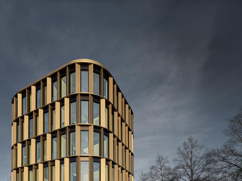 Der Bronze-Ton der eloxierten Fassadenpaneele sucht die Nähe zu den verputzten Lochfassaden der benachbarten Wohnbauten und setzt dennoch den gewünschten Akzent, der auf die halb-öffentliche Nutzung aufmerksam macht. Die keilförmigen Metallelemente, hinter denen Lüftungsflügel verborgen sind, wechseln sowohl in der horizontalen Abfolge wie auch geschossweise ihre Ausrichtung. Sie geben der Fassade Tiefe und erzeugen ein Spiel mit Licht und Schatten, das sich mit dem Sonnenstand facettenreich verändert und dabei Vielfalt und Diversität impliziert.