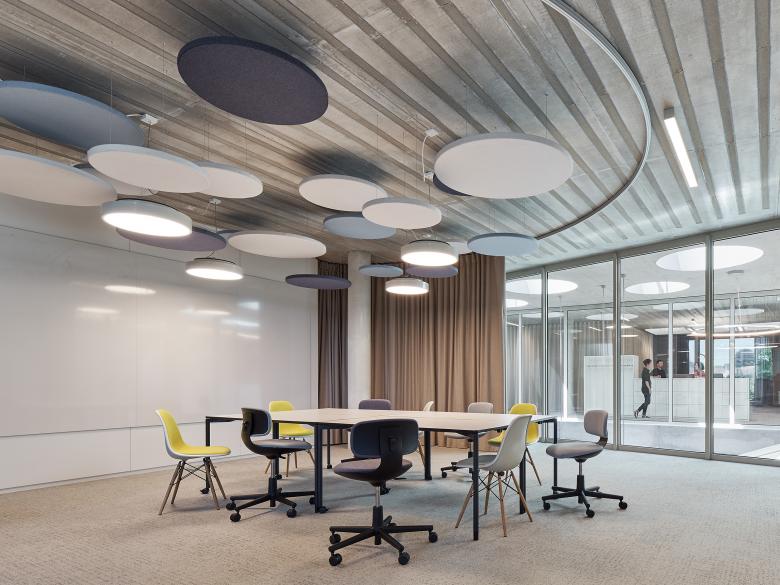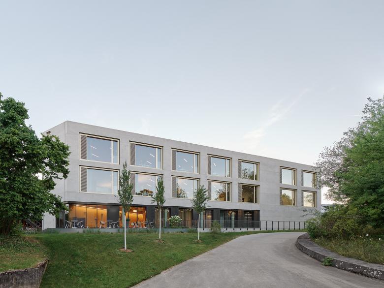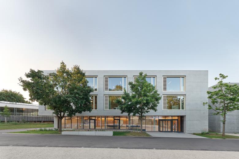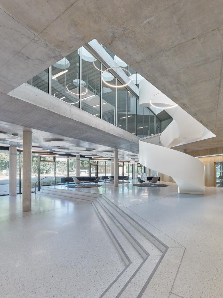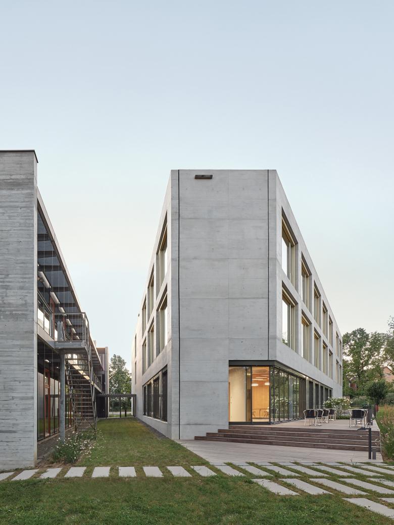 Der neue Hauptsitz des Steinbeis-Verbundes ist ein Erweiterungsbau einer von unserem Büro bereits 2000 fertiggestellten Privathochschule. Der Neubau mit seiner unregelmäßigen Grundfläche nutzt das dreieckige Baufeld maximal aus. In den Obergeschossen wird die Fassade durch großzügige Fensterelemente in nur einer Größe rhythmisiert, während im Erdgeschoss bodentiefe Fassadenbänder auf die hier anzutreffenden Sondernutzungen reagieren und das Foyer optisch auf voller Breite zum Außenraum öffnen. Im Inneren gliedert ein unregelmäßiges, von oben belichtetes Atrium die Büroflächen der Obergeschosse in vier kleinere Einheiten und dient zudem mit seiner eingestellten Wendeltreppe als vertikale Haupterschließung des Hauses. Über die großzügigen Fensterelemente der Außenfassaden und die verglasten Innenfassaden zum zentralen Atrium entstanden gut belichtete, transparente und übersichtliche Büroflächen, die sowohl individuelle Arbeitsplätze als auch Kommunikations- und Rückzugsorte ausbilden.