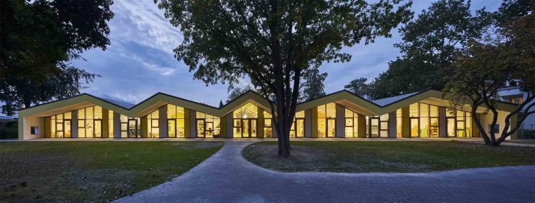 Prägend für die äußere Gestalt ist die gefaltete Dachlandschaft, die vom ersten Blick an ein Gefühl des Miteinanders transportiert. Die weite Auskragung des Daches besitzt neben seiner funktionalen und identitätsstiftenden Idee auch die Funktion des sommerlichen Wärmeschutzes.