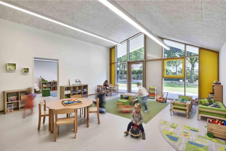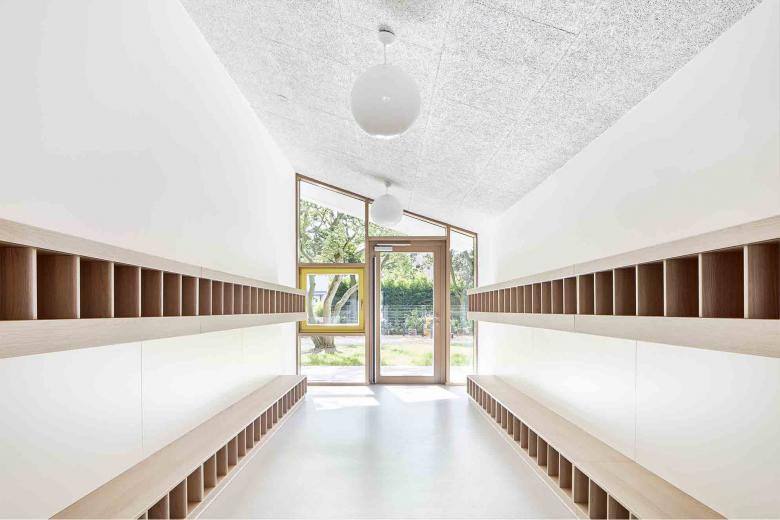 Die Südfassade öffnet sich spielerisch dem von Bäumen gerahmten Außenraum und stellt einen direkten Bezug zu jedem Gruppenraum her. Die Dachneigungen sind auch innerhalb des Gebäudes erlebbar und strukturieren den Baukörper auf eine subtile Art. Die bewusst reduzierte farbliche Gestaltung bietet Platz für kindliche Kreativität und schafft gleichzeitig einen Wiedererkennungswert. Die großzügigen Gruppenvorräume profitieren von der Durchlässigkeit der Südfassade und werden so zu einem freundlichen Ort der Begegnung.