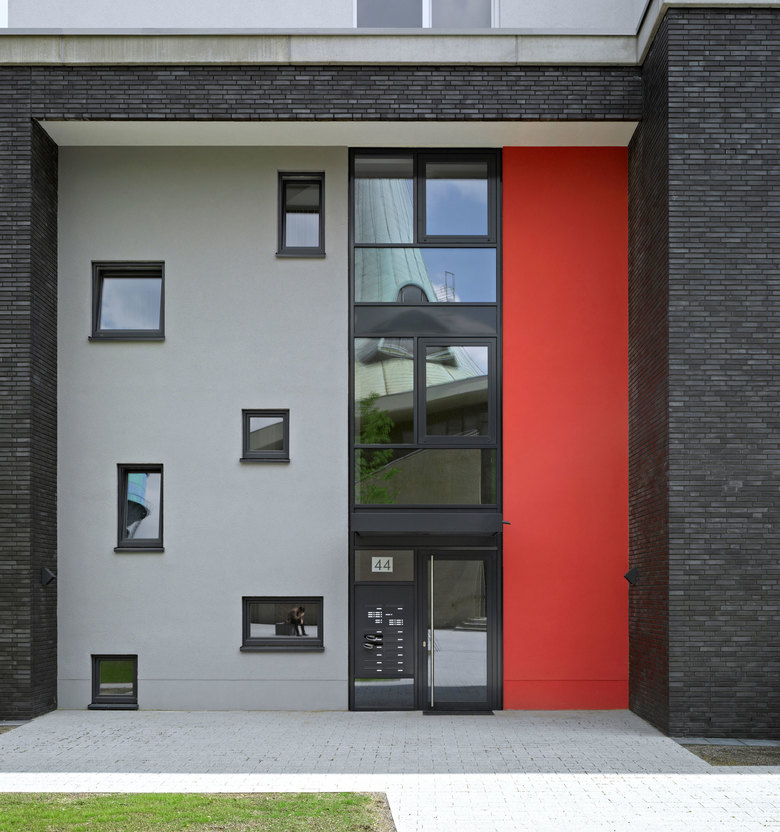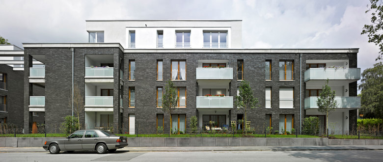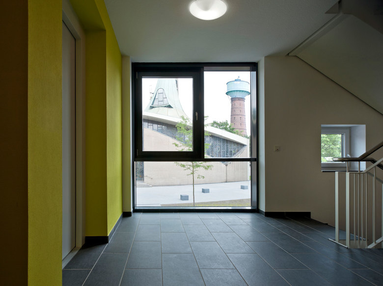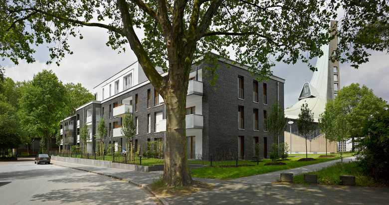 Die Kirche St. Josef von Prof. Robert Kramreiter aus Wien, die 1968 errichtet wurde, ist prägend für die Neubebauung. Zwei straßenbegleitende Baukörper mit 31 Wohnungen - durch ein gemeinsames Dach verbunden - bilden die Fassung des Kirchenvorplatzes. Somit werden die wichtigen Verbindungen von dem umgebenden Wohnquartier zur Kirche erhalten. Das Bauvorhaben umfasst 31 Wohnungen unterschiedlicher Wohnungsgröße - von 45m² bis 107m² und einer Gesamtwohnfläche von 2.213m². Durch den Aufzug sind alle Wohnungen und die Tiefgarage barrierefrei. Das Sichtmauerwerk der Fassade ist durch die farbigen Flächen rhythmisch gestaltet und schafft einen lebhaften Fassadeneindruck. Bei allen Wohnungen bilden das Wohnzimmer, die Küche und der Essplatz eine räumliche Einheit. Energetisch optimiertes Bauen ist ein wichtiger Baustein der Neubauten. Mit einem Jahres-Primärenergiebedarf von 26 kWh/m²a für die Gebäude werden nur 50% der Primärenergie für Neubauten gemäß Energieeinsparverordnung verbraucht. Somit erfüllen wir auch den KFW-55 Standard. Frische Raumluft schafft eine mechanische Wohnraumlüftung mit Wärmerückgewinnung. Die Nutzung der Fernwärme als nicht fossile Heizenergie reduziert die CO²-Bilanz der Bebauung erheblich.