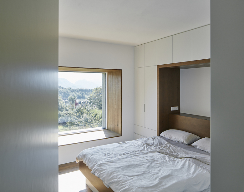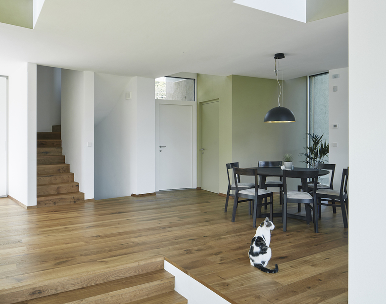 Zwischen drinnen und draußen – Wie in einem Dorf, spielt sich auch im Haus D. das eigentlich Leben zwischen den Häusern ab. Man begegnet sich auf der zentralen Piazza wo die im Erdgeschoß gelegenen Wohnräume ineinanderfließen. Durch Lufträume ergeben sich von hier aus horizontale und vertikale Blickbeziehungen quer durch das Gebäude, wobei die Intimität der Räume nach oben hin zunimmt. Durch Glasfugen zwischen den massiven Baukörpern genießt man vom zentralen Wohnraum aus quasi einen 360° Rundumblick und erhält Tageslicht aus allen Himmelsrichtungen. Innen und Außen verschmelzen besonders dort stimmungsvoll miteinander, wo sich der aus der Umgebung abgeleitete Pistazienton der Fassaden konsequenterweise im Inneren fortzieht. Wo Außenwände zur Innenwand werden, entwickeln sie sich teilweise zu Möbeln und anderen Bauteilen, welche die Kontur der Türme vervollständigen.