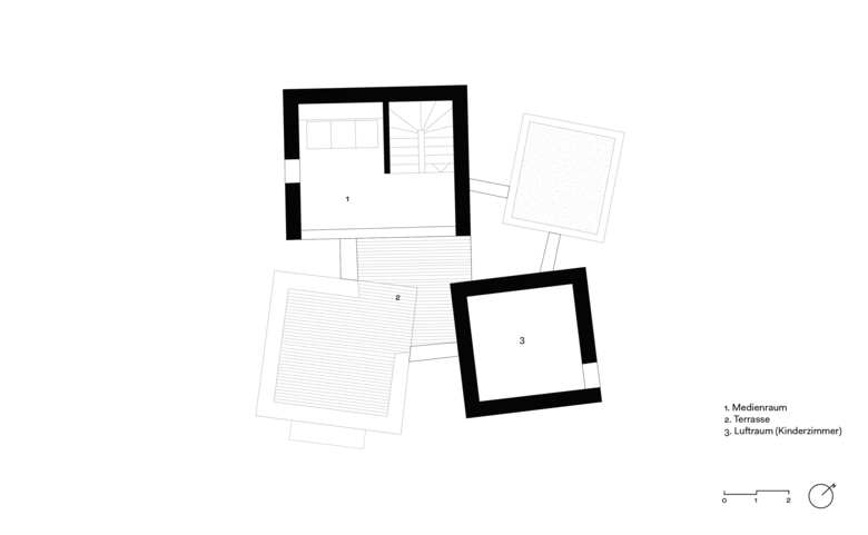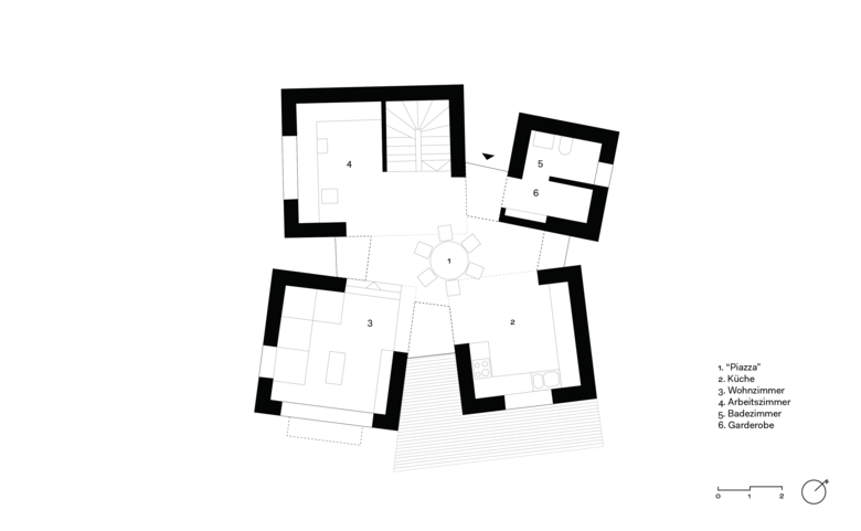 Vier in einem – Rund um eine hausinterne Piazza wurden vier turmartige Baukörper arrangiert die nach außen relativ homogen sind, nach innen jedoch entsprechend ihrer unterschiedlichen Funktionen einen ganz eigenen Charakter haben. So befinden sich die Nassräume im sogenannten Wasserturm, die Treppe im Stiegenhaus und in zwei weiteren Volumina mehrere Schlafzimmer sowie ein Arbeitsraum und ein Medienraum. Brückenartige Galerien stellen Verbindungswege zwischen den Baukörpern her, wobei die Raumhöhen entsprechend der unterschiedlichen Funktionen variieren und spannende räumliche Situationen entstehen lassen.