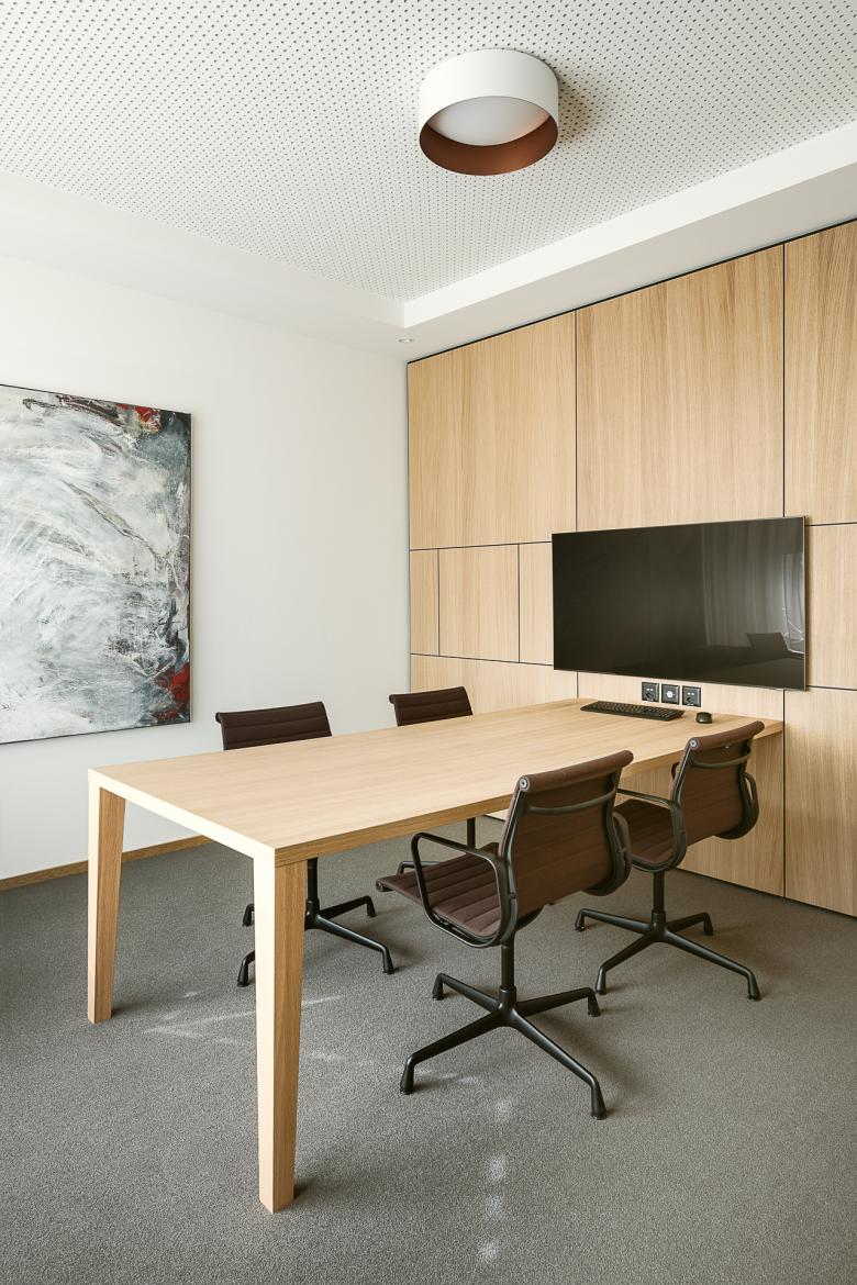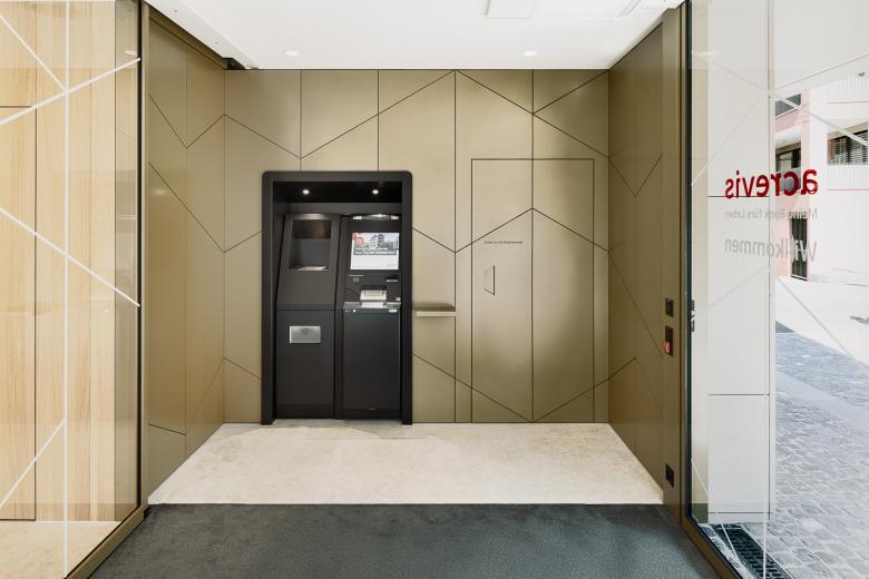 In der neuen acrevis Niederlassung in Lachen SZ vereinen sich helle Materialien, dynamische Formen und durchdachte Funktionalität zu einem Raumkonzept, das Vertrauen schafft. Mit der Überzeugung, dass eine Bank heute mehr als nur ein abgesicherter Tresor sein sollte, wurde eine einladende Atmosphäre geschaffen, die Offenheit und Modernität ausstrahlt. Die ungewöhnliche Dreiecksform des Gebäudes stellte eine gleichzeitig Herausforderung und Chance dar, abseits klassischer Raumaufteilungen ein innovatives Konzept zu realisieren. Der Eingang an der Spitze der Nordseite führt Besucher direkt in die 24-Stunden-Zone mit dem Bancomaten. Hier setzt eine Wandverkleidung aus bronzefarbenem Aluminiumblech mit hexagonalen Mustern markante Akzente, die an die Prinzipien von Fleiß und Präzision erinnern – Werte, die auch eine Bank verkörpert. Die Formensprache und Materialwahl, wie der Boden aus istrischem Kalkstein, wurden bewusst gewählt, um eine Verbindung zur Gestaltung des Hauptsitzes in St. Gallen zu schaffen. Dies unterstreicht die konsistente Ästhetik und Identität der acrevis Bank über verschiedene Standorte hinweg.