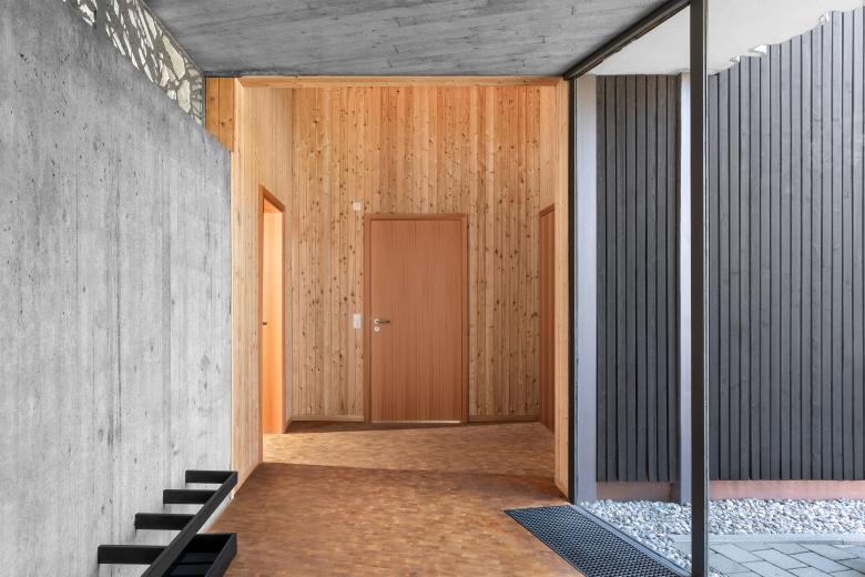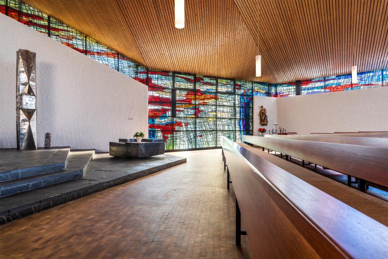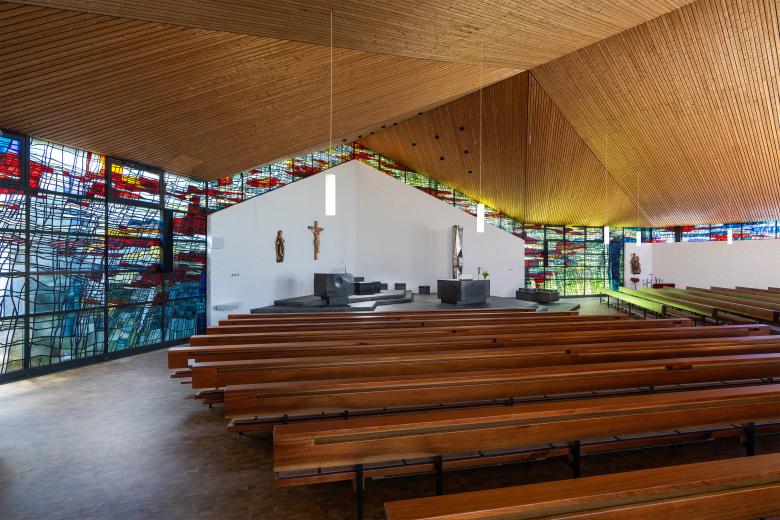 Der neue Gemeinderaum zitiert in seiner Innenraumgestaltung die Materialität des Kirchenraumes: dort wurden für Decke und Fußboden ebenfalls Holz verwendet. Die Vorfertigung von Gebäudeteilen und die damit verbundene Verkürzung der Bauzeit sprach zusätzlich für die Verwendung von Holz als Baustoff. Die Gestaltung innen und außen ist schlicht und zurückhaltend, das Holz bleibt sichtbar. Sie passt sich unaufdringlich an den Kirchenbau an. So strahlt der Raum eine warme Atmosphäre aus, die durch dezente, indirekte Beleuchtung unterstrichen wird. Große Fensterflächen lassen den Blick ins Grün der Umgebung frei. Der Zugangsbereich der Kirche ist von Sichtbetonoptik geprägt, so fügt sich nahtlos und harmonisch der Erweiterungsbau an.