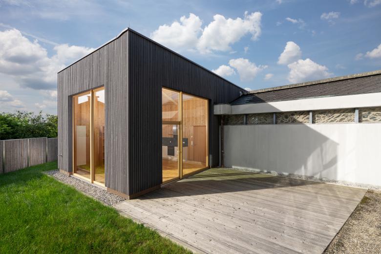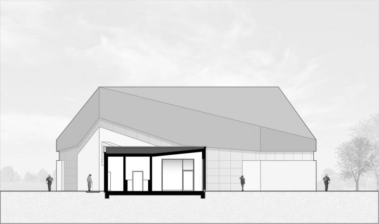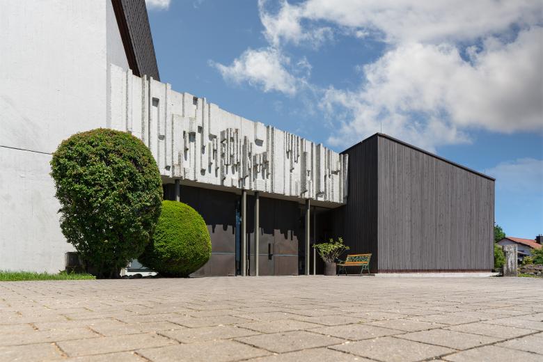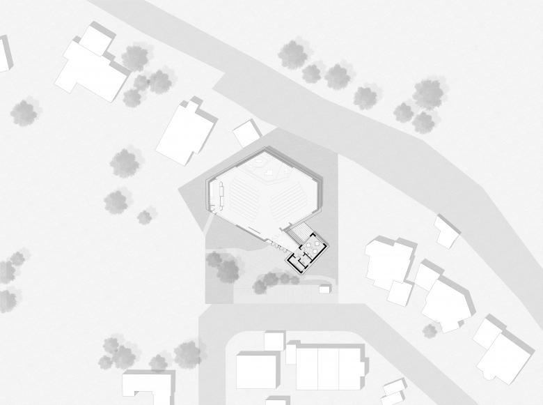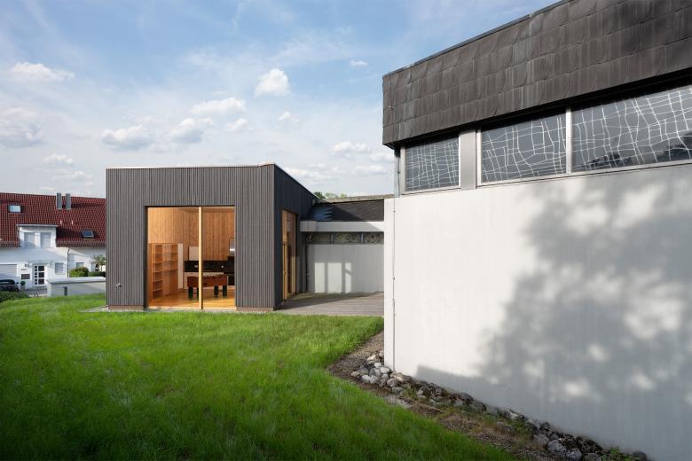 Der Erweiterungsbau lehnt sich dezent an das Kirchengebäude an und fügt sich unaufdringlich auf dem Grundstück ein. Es reagiert zurückhaltend auf die Umgebung, die sich aus Einfamilien- und Reihenhäusern zusammensetzt.