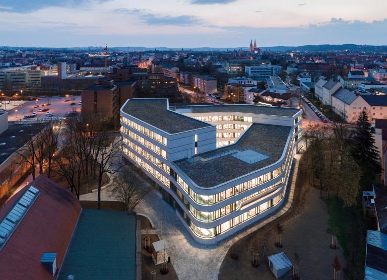 Ziel war es, ein wertiges, offen angelegtes Gebäude mit zeitgemäßen Arbeitswelten zu entwickeln, in dem sich die 460 Mitarbeiter und ihre Kunden willkommen fühlen und gerne aufhalten. Der um einen großzügigen Innenhof entworfene, dreieckige Baukörper reagiert mit seinen unterschiedlich hohen und leicht geschwungenen Längsseiten sensibel auf die Gebäude in der Nachbarschaft.
