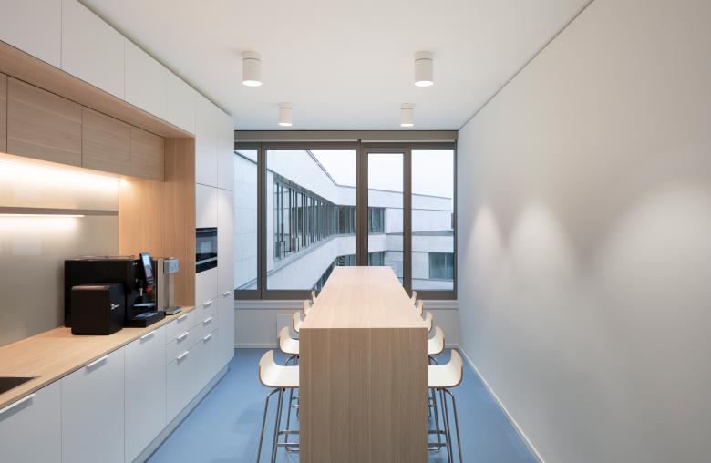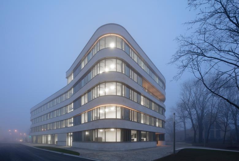 Durch das in sich geschlossene Gebäude entstehen im Inneren sehr flexibel nutzbare lichtdurchflutete Flächen, die sich leicht an wechselnde Anforderungen der modernen Arbeitswelt anpassen lassen. Warme helle Materialien wie z.B. Holz im Innenbereich harmonieren mit dem in der Fassade verwendeten regionalen Naturstein Kelheimer Auerkalk.