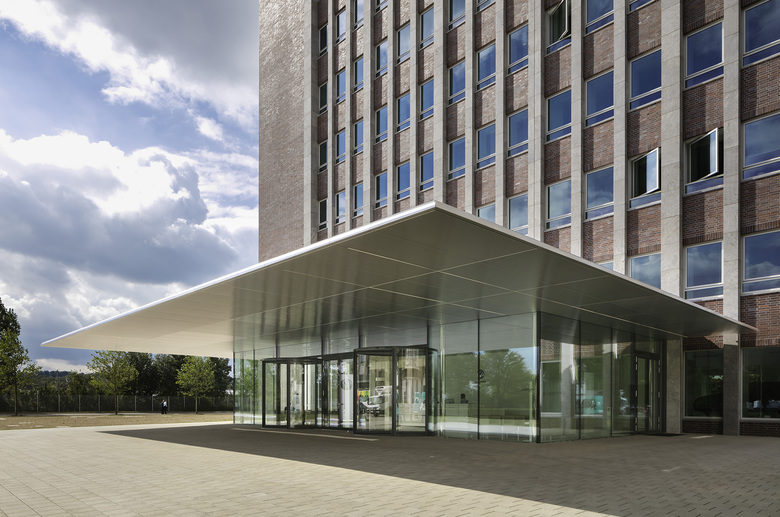 Das Gebäude erhält zwei neue Eingänge, die in ihrer eleganten und filigranen Erscheinung das Bestandsgebäude außen deutlich wahrnehmbar ergänzen. Die zeitlose Gestaltung mit Flugdächern respektiert die bisherige Formensprache des Verwaltungshochhauses und ergänzt sensibel und zurückhaltend das Gebäudeensemble.