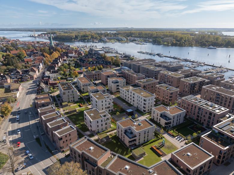 Im Zuge eines städtebaulichen kooperativen Verfahrens wurde auf dem Grundstück „Auf dem Baggersand“ in unmittelbarer Hafennähe auf mehreren Baufeldern durch vier Bauherren und vier Architekturbüros unter Moderation der Stadt ein neues Wohnquartier entwickelt.