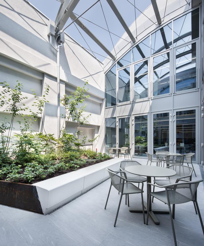 Nello storico corpo centrale di circa 4000 mq di superficie sono stati inseriti tre grandi patii alberati che portano luce naturale all’interno degli spazi di lavoro e aumentano gli affacci verso l’esterno.