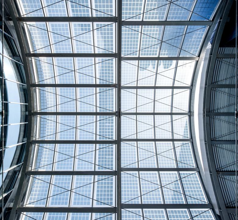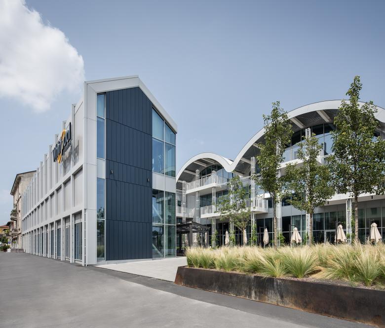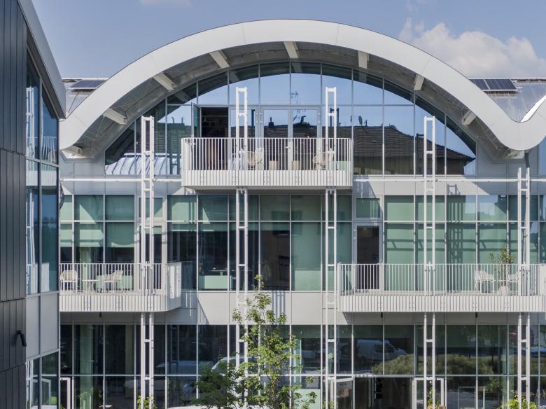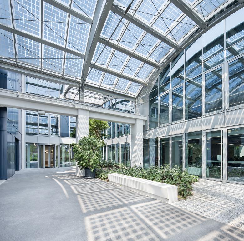 La facciata vetrata del nuovo edificio sulla piazza è scandita verticalmente da pilastri reticolari che si innestano nelle grandi terrazze sospese pensate come spazio di lavoro informale all’aperto ma anche come schermature solari. I pilastri reticolari passanti sono stati concepiti per accogliere la crescita di rigogliosi glicini.
