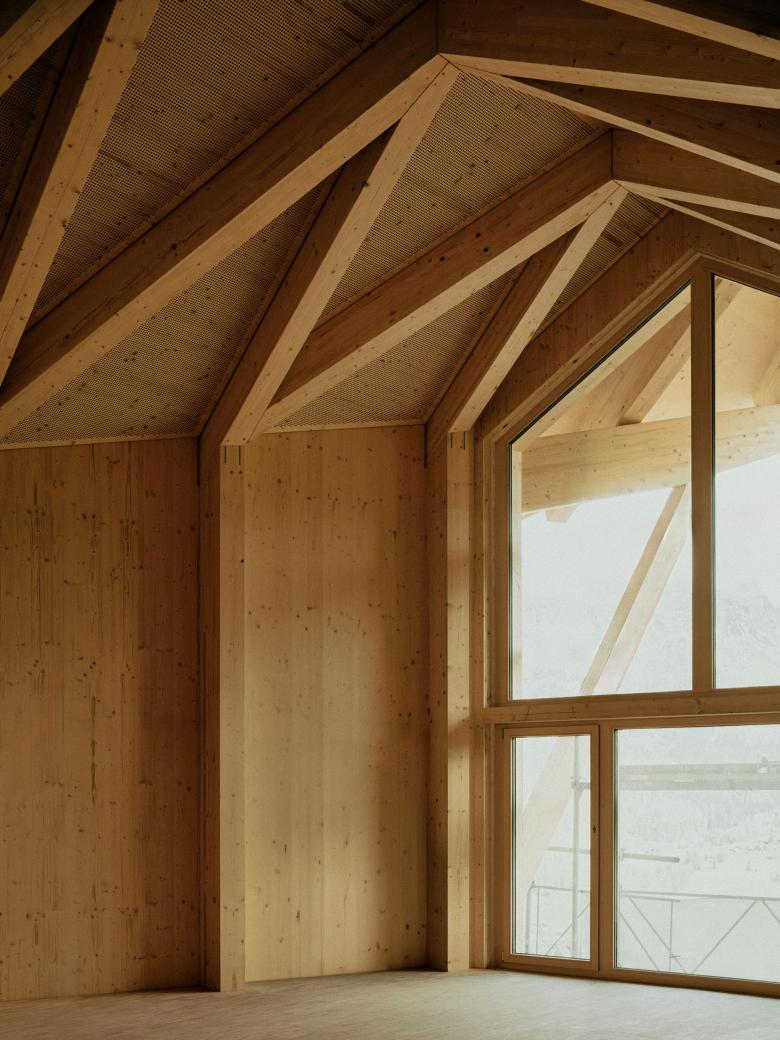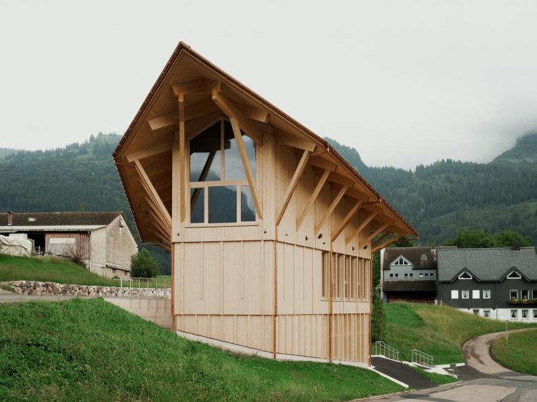 Mit seinem mehrschichtigen Programm bietet das als Holzbau konzipierte Haus Orientierung und Schutz und stellt ein Gefäss bereit für Anlässe und Ausstellungen. Der Austausch, die Gemeinschaft und die Vermittlung der Klangwelt von Peter Roth stehen dabei im Zentrum. Diese Inhalte finden in der Gestalt des Baukörpers, seiner eigenständig konstruktiven Durchbildung und dem rhythmischen Fassadenbild ihren Widerhall. / Die dreiecksförmige Parzelle mit sechs Meter Quergefälle erlaubt eine Gebäudefläche von maximal 200 m2. Diese Rahmenbedingungen führen zu einer Stapelung des Programms auf drei Geschossen über einer rhombusförmigen Grundfläche. / Seine spezifische Volumetrie erhält der Baukörper durch den rautenförmigen Grundriss, der sich allseitig unterschiedlich in das Gelände einschreibt und in Kombination mit dem weit auskragenden Satteldach eine markante und einprägsame Figur generiert. / Das Gebäude ist als Holzständerbau errichtet. Die Skelettkonstruktion aus einzelnen Stützen, Trägern und Sparren werden mit dazwischen- gehängten Holzelementen in der Fassaden- und Dachebene ausgesteift. Die Oberflächen des Holzbaus bleiben sowohl innen wie aussen naturbelassen.