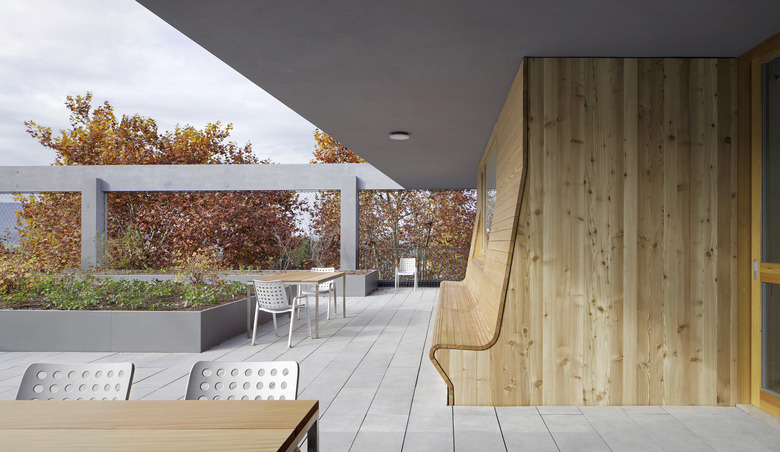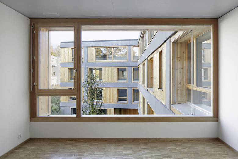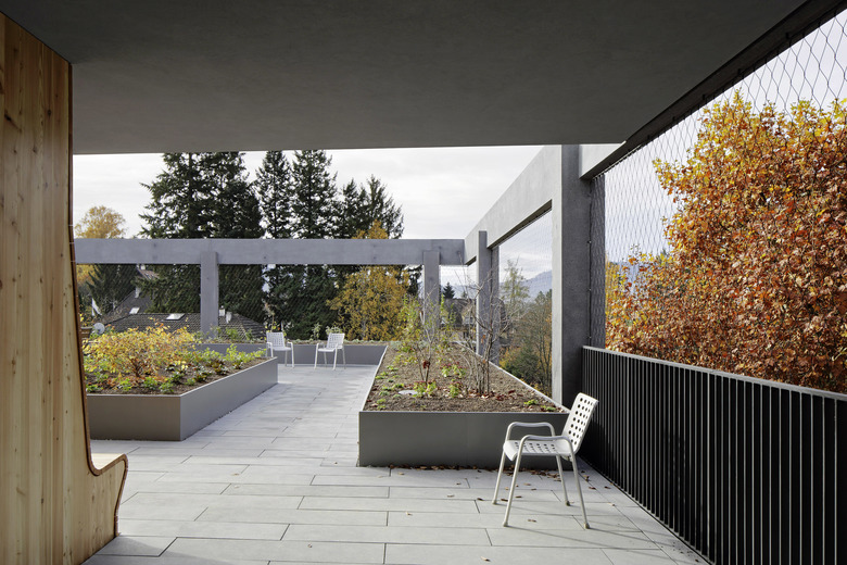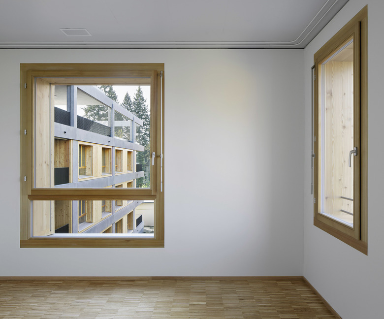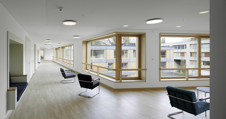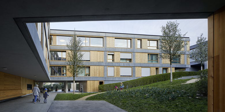 Das vom Gelände und den bestehenden Gebäuden mitgeformte Neubauvolumen vermittelt zwischen dem sich entlang der Höhenlinie ausstreckenden Volumen der Alterswohnungen und den auf unterschiedlichen Niveaus stehenden Einzelvolumen des privaten Wohnens. Das gesamte Raumprogramm (Demenzabteilung und Familienwohnungen) wird in einem Gebäudekörper zusammengefasst. Dies ermöglicht den Bereich für die leichte bis mittelschwere Demenz als autonome, kleine, allseitig orientierte Welt auf dem obersten Geschoss mit angegliedertem Demenzdachgarten zu organisieren. Die rundlaufbildende Raumfigur des Erschliessungs- und Aufenthaltsbereiches folgt dem Bewegungsdrang der Bewohner.