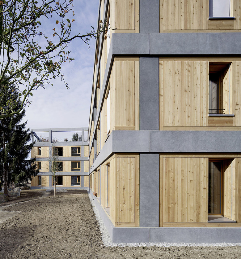 Die natürliche Topografie des Ortes ermöglicht die Bildung zweier klarer autonomer Adressen für die Familienwohnungen und das Demenzhaus. Die Ausrichtung sämtlicher Wohnungen erfolgt einerseits in den umgebenden Wohnkontext sowie in den kollektiven Hofaussenbereich der Wohnungen. Als Ergänzung zum Raumprogramm wird ein Gästezimmer für Angehörige der Obesunne sowie Gäste der Familienwohnungen vorgeschlagen. Die äussere Erscheinung des Neubaus nimmt Themen der Fassadengliederung des bestehenden Alterswohngebäudes auf. Eine gleichmässige, die tragende Struktur abzeichnende Gitterstruktur ordnet und gliedert den Baukörper. Die Gitterstruktur aus Beton erhält, der Typologie folgend, eine Füllung aus Holz und Fenster. Die natürliche Farbigkeit der einfachen Materialien prägt die Erscheinung und bildet eine würdevolle Patina im Laufe der Zeit. Das Gebäude der Erweiterung bildet einen weiteren Baustein des Areals und bindet räumlich die westlich des Bromhübelwegs liegenden Volumen der Obesunne an das Haupthaus des Altersheims an.