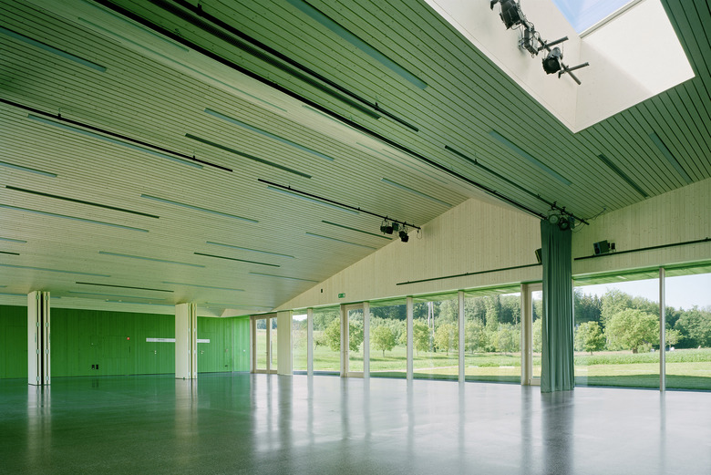 Die neue Mehrzweckhalle welche als Schulaula, Abdankungshalle sowie als Gefäss für das Vereinsleben gebaut wurde, bildet am Rande des Dorfes den städtebaulichen Schlussstein der Siedlung auf dem Weg zum gefassten Friedhofsareal.