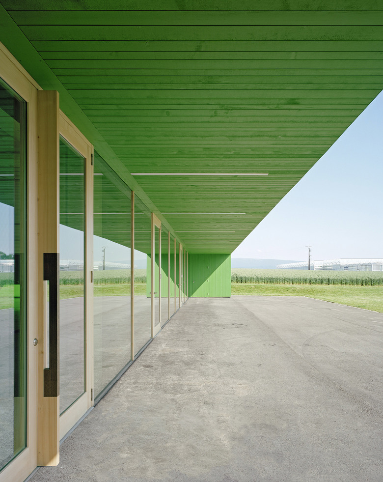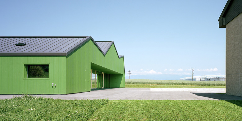 Typologisch angelehnt an die ortsprägenden Gewächshäuser übernimmt der neue Baukörper ortstypische Elemente und deutet sie zu einer eigenen formalen Sprache um. Aufgespannt zwischen den beiden Fusspunkten mit den Serviceräumen, wird der grosse Hallenraum Teil des Weges zum Friedhof. Der polyvalent nutz- und erweiterbare Raum ist mittels Trennwänden und Vorhängen unterteilbar. Je nach Raumaufteilung entstehen durch die gefaltete Decke angemessene differenzierte Raumatmosphären, die einen Rahmen für die unter schiedlichen Bespielungen bilden, von Schulaufführungen bis zu Abdankungsgottesdiensten. Das Raumkonzept des aufspannten grossen gedeckten Raumes mit fliessendem Bezug zum angrenzenden offenen Landschaftsraum findet konstruktiv in der brückenförmigen Tragstruktur aus Fachwerkträger in Holz ihre konstruktive Entsprechung. Das Konstruktionsmaterial Holz prägt auch die äussere Erscheinung des Gebäudes und nimmt Bezug auf traditionelle Oekonomiegebäude im Seeland. Die Fassaden erhalten eine sägerohe grünpigmentierte satt gestossene Tannenschalung, welche je nach Distanz des Betrachters ein Changieren zwischen abstrakter Körperlichkeit und habtischer Materialität erzeugt. Das Bekleiden mit Holz wird im Gebäudeinnern als Futteral im Saalbereich weitergeführt.