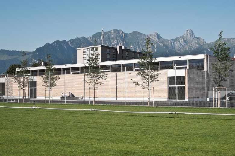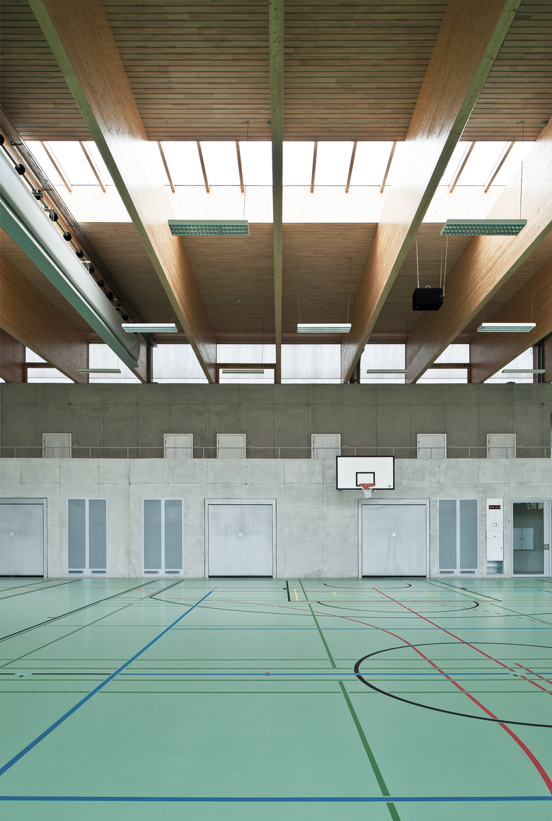 Die neue Sporthalle Schadau ergänzt die Bauten des gleichnamigen Gymnasiums in Thun. Der neue Gebäudekörper wird direkt an der stark befahrenen Frutigenstrasse, als Abschluss der Wohnbauten platziert. Über das Absenken der Halle und die filigrane Materialisierung fügt sich der grosse Neubau harmonisch in das kleinmassstäbliche Wohnquartier ein. Der Neubau wird ab der Oberkante des Terrains aus Holz erstellt und mit einer feingliedrigen Douglasien-Fassade bekleidet, welche im Laufe der Zeit natürlich verwittert. Durch die grosszügigen Verglasungen und die Repetition der einzelnen Elemente erhält der Hallenraum eine ruhige, lichtdurchflutete Stimmung. Prägende Materialien sind helles Fichtenholz im Zusammenspiel mit Sichtbeton und einem lindengrünen Sportboden.