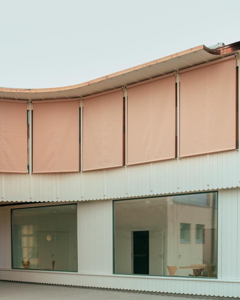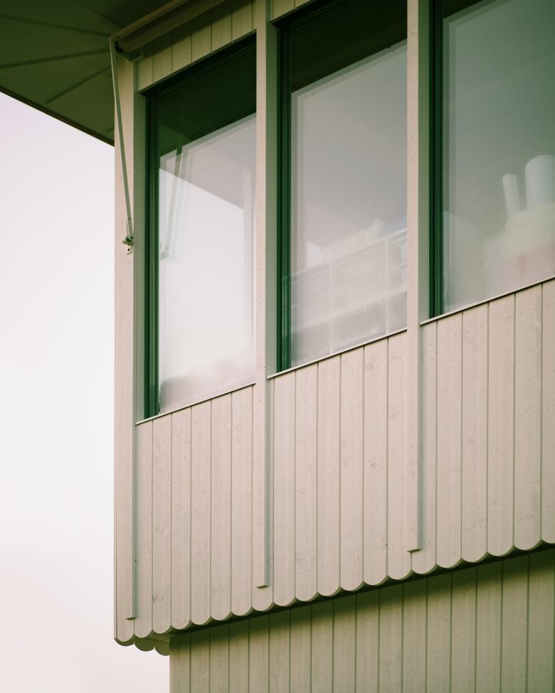 Der Rücksprung im Erdgeschoss und die Stapelung der unterschiedlichen Nutzungen zeichnet sich in der Fassade ab. Das obere Geschoss springt leicht vor und weisst eine kleinteiligere Befensterung und Gliederung auf. Die Fassade wird bewusst dünn gehalten, ist sehr präzise gefügt und wirkt fast wie Papier.