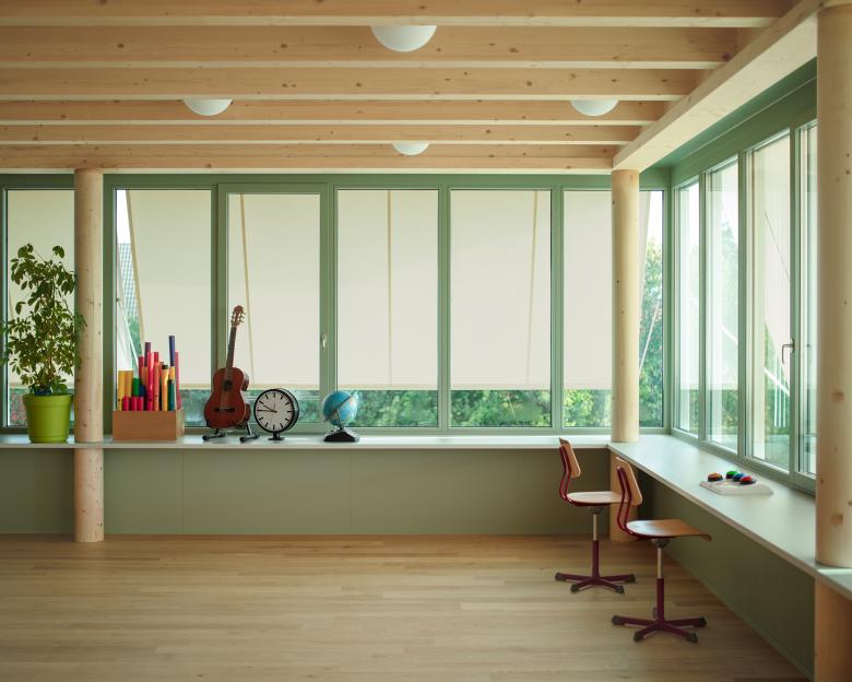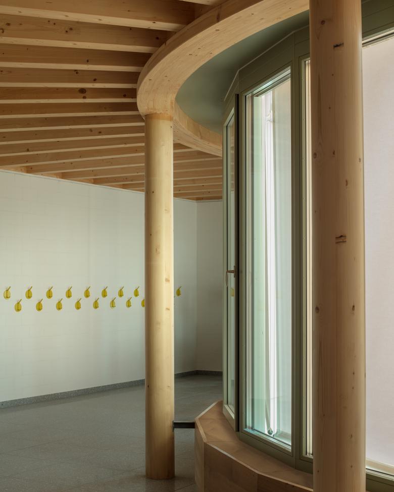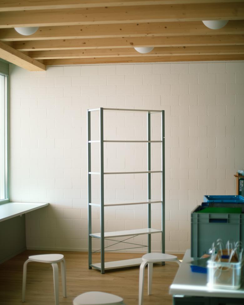 Das Holztragwerk des Daches schafft in den Unterrichtsräumen eine warme Atmosphäre und nimmt in den Zwischenräumen die Leuchten auf. Einzelne Elemente wie Schränke, Kleiderhaken und die Fenster werden farbig behandelt und werden damit bewusst von den weissen Wänden und dem Holztragwerk abgelöst.
