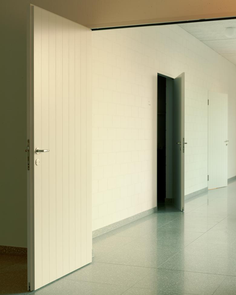 Die bandartigen Fenster in den Unterrichtsräumen im Obergeschoss lassen den Blick in die Ferne zu. Im Erdgeschoss wurden in der Gemeindeverwaltung einzelne sehr grosse Fenster mit geschlossenen Lüftungsflügeln einsetzt, welche den Blick rahmen und viel Tageslicht in die Arbeitsräume lassen.