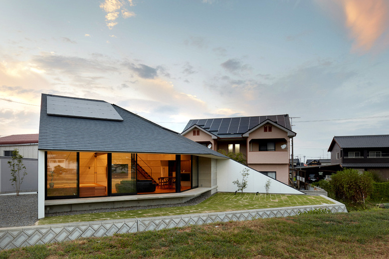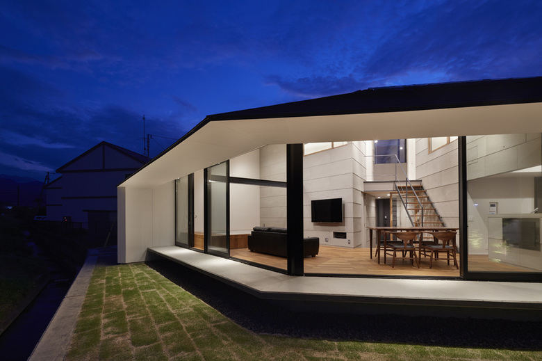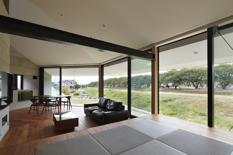First, in consideration of the environment where wind passes from east to west, a blank space was left on the west side of the site, and the building was placed on the east side. The building was then divided into two parts and opened up in a fan shape to maximize the view. The east exterior wall extends to the ground in line with the slope of the roof, and not only functions as a fence to gently block the view of the neighboring houses, but also seems to reach out in the direction of the scenic view, gently enveloping the house from a different perspective. In addition, by opening a gap in the fan-shaped form, a valley is created that serves as a ventilation channel, allowing cool breezes from the river to pass through the living rooms. The entranceway opens through the approach on the west side, revealing a valley with light streaming in from the back, through which a panoramic view spreads out, creating a story of flow lines. This creates a variety of interior expressions. The terrace with full frontage leading from the LDK is protected by deep eaves and provides a place for various gatherings.