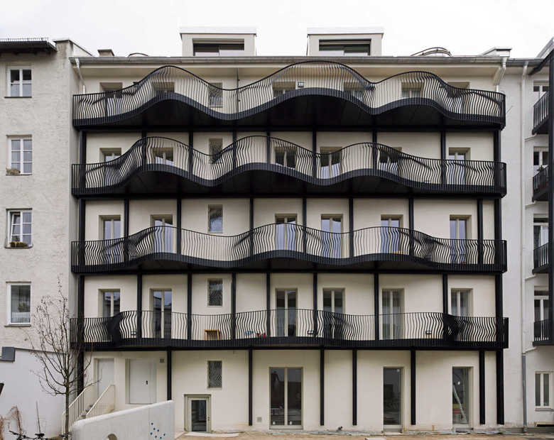 Die dreiteilige Gliederung der Fassade greift ein seinerzeit gängiges Gestaltungsmittel, sogenannte Bossen, auf und verfremdet es zugleich: Durch unterschiedliche Höhe der einzelnen – hier in Putz ausgeführten – überstehenden Elemente entsteht ein wellenförmiges Relief. Diese Fassadenstruktur erzeugt ein je nach Sonnenstand und Blickwinkel differenziertes, eindrucksvolles Schattenspiel. Die ursprünglich antikisierende „Schwere“ der Bossen gerät dadurch in einen reizvollen Gegensatz zur Beweglichkeit der Lichtstimmungen. Der spielerische Umgang mit kontrastierenden Gestaltungselementen und das prägende Wellenmotiv finden ihre Fortsetzung im ruhigen Innenhof. Organisch geformte, in den Etagen intelligent zueinander versetzte Balkonflächen laufen über die gesamte Gebäudebreite und erzeugen ein Wechselspiel aus Enge und Weite, Privatheit und Offenheit. Erschlossen werden sie durch raumhohe Fenstertüren, wodurch sich die Belichtungssituation der Wohnungen wesentlich verbessert.