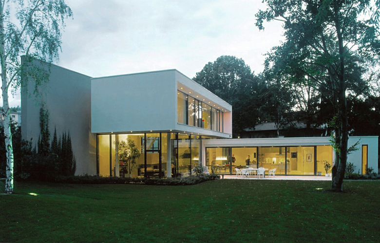 Diese Villa befindet sich in Frankfurt in unmittelbarer Nähe zum Grüneburgpark. Das zweite Geschoss liegt als ein riesiger Block über dem Erdgeschoss. Ein zweigeschossiger Wohnraum entsteht an der Stelle, an der die Blöcke zusammenkommen. Das Erdgeschoss ist als offener Grundriss geplant. Küche, Essbereich und Wohnbereich sind lediglich durch die Möblierung unterteilt. Eine Treppe führt hinter dem Kamin ins Obergeschoss. Hier befinden sich Schlafzimmer, Gästezimmer, Garderobe und das Badezimmer. Unter der Verwendung von authentischen und luxuriösen Materialien wie Makassarfurnier, getöntem Glas, weißem Marmor und Möbel von B&B ITALIA entstand eine puristische und konzeptionelle Villa.