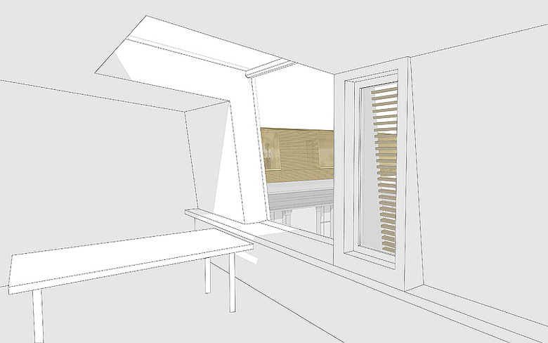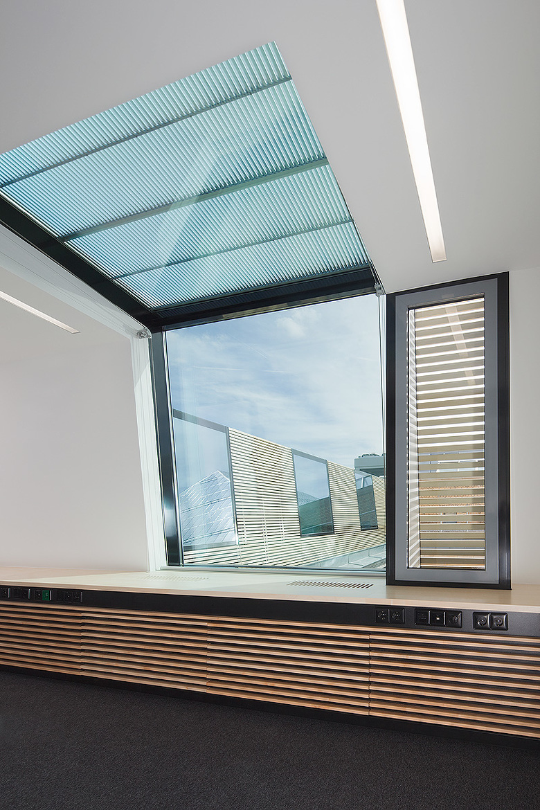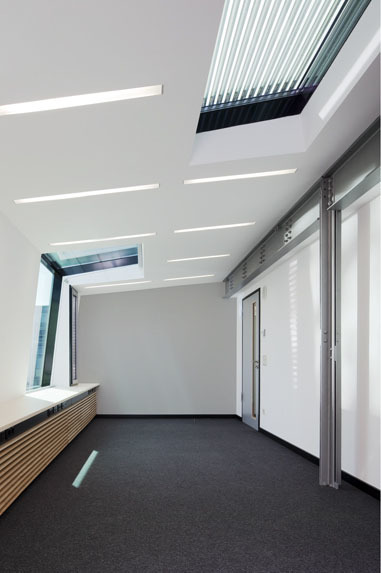 Die den 4 Innenhöfen zugewandten geneigten Dachflächen werden mit 22 Büroräumen für die Fraktionen des Abgeordnetenhauses von Berlin ausgebaut. Die vorhandene Fläche des ca. 3 Grad geneigten flachen Dachs wird weitergeführt, die Dachschräge wird nicht ganz bis zur Senkrechten aufgeklappt, um auf den Ausblick aus dem Hof (von unten) zu reagieren. Der Knickpunkt des Daches verschiebt sich in Richtung Traufe. Die bestandsbedingt relativ niedrigen Büroräume erhalten zum Ausgleich eine großzügige Fensteröffnung, die aus einem festverglasten Fenster mit Überkopfanteil und einem seitlich positionierten Lüftungsflügel bestehen.
