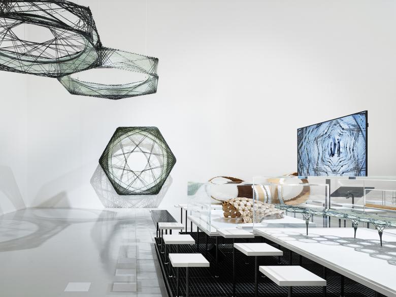 Die Ausstellung vermittelt die Themen in zwei Bereichen, die inhaltlich aufeinander referieren: Im »Design Labor« wird der Prozess des Gestaltens beleuchtet – im Fokus stehen Ideenfindung, Gestaltungsprinzipien und Entwicklung von Prototypen. Der Besucher wird eingeladen, sein Augenmerk mit einem interaktiven, medialen Zugang auf den Designprozesses zu legen, der hinter dem fertigen Produkt steht. Die Gestaltung des »Design Labors« ist an den Exponaten ausgerichtet. Sie werden auf einem Feld aus über 1000 aufgeständerten Pins präsentiert, das durch einen Computeralgorithmus berechnet wird und dem Prinzip des parametrischen Modellierens folgt: Durch den Algorithmus berechnet, reagiert das Feld topographisch auf Größe und Form der Exponate. Es lässt die Ausstellungsstücke in den Vordergrund treten und setzt sie zueinander in Beziehung.