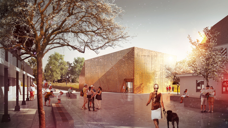 Les bâtiments existants retrouvent leur gloire d’antan ; la reconstruction des écuries est contemporaine, mais reste toutefois modeste. Un dégagement vertical sur l’entier du volume submerge l’entrée de lumière naturelle et permet, de nuit, un regard sur la voûte céleste. En contraste, le planétarium se veut volontairement iconique, enveloppé par une mystérieuse façade semi-transparente en panneaux perforés. Il est défini par une géométrie anguleuse forte – une constellation, une météorite, un vaisseau spatial – la nouvelle construction revendique clairement son appartenance céleste. Une cour minérale relie désormais l’ensemble. Rétablissant ainsi la balise nord de la ville, le nouveau planétarium s’implante face à sa contrepartie historique, créant un dialogue où chacun des volumes peut s’exprimer au travers de l’architecture de son temps.