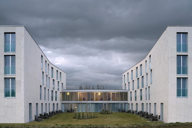 Latéralement, l’hôtel s’ouvre sur une vaste esplanade qui glisse sous la route et crée un lien fort avec le campus. Un quatrième volume contenant des salles de séminaire vient fermer le projet du côté sud-ouest. Le plan en peigne trouve ici son originalité dans une géométrie légèrement irrégulière, convexe et fuyante. Plus qu’un jeu formel, ce dessin confère à l’ensemble un réel dynamisme, évitant ainsi la monotonie des couloirs typiques de l’architecture hôtelière.