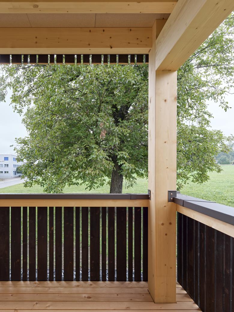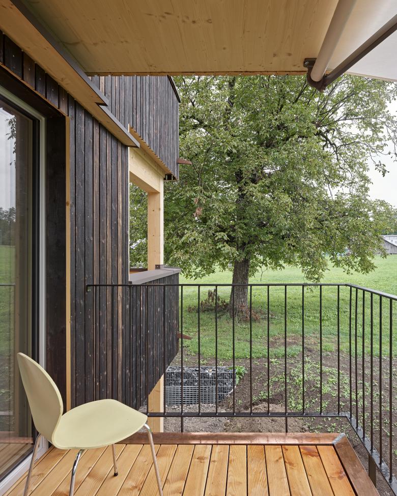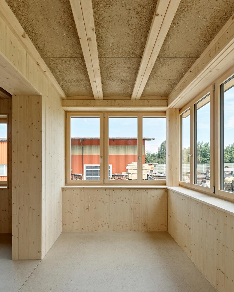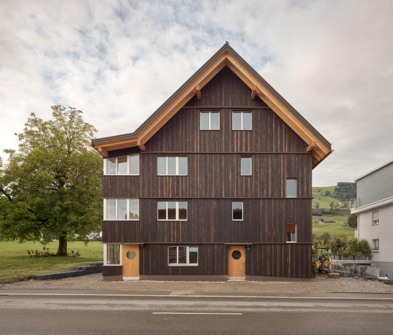 Ziel des Projektes war ein pragmatisches Gleichgewicht zwischen Ökologie und Ökonomie, damit Energie, Ressourcen und Finanzmittel möglichst sparsam eingesetzt werden können. Die Gebäudeform entspricht den historischen Bauernhäusern in der Umgebung, das grosse Dach schützt das Gebäude und dient der Elektrizitäts- und Wärmeproduktion. Die Tragstruktur des Gebäudes ist ein einfacher Holzrahmenbau mit robotergestampften Holzlehmdecken der Firma rematter. Der nichttragende Stampflehm zwischen den Holzrippen dient dem Brandschutz, dem Schallschutz, sowie dem Temperatur- und Feuchtigkeitsausgleich. Die Holzfassade wird leicht karbonisert und geölt, damit das Material auf natürliche Weise geschützt ist.