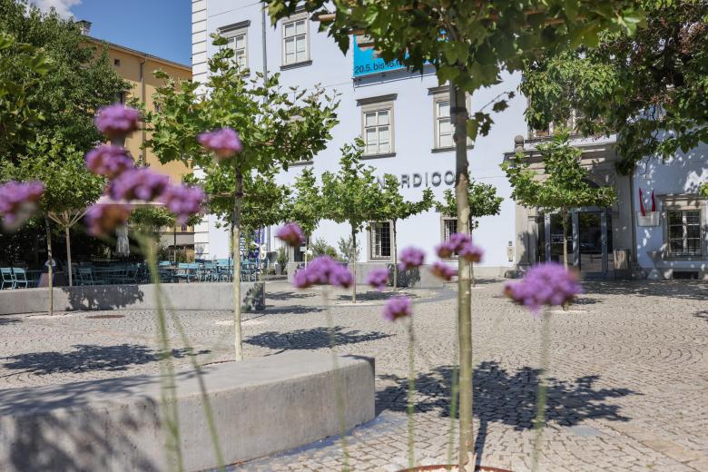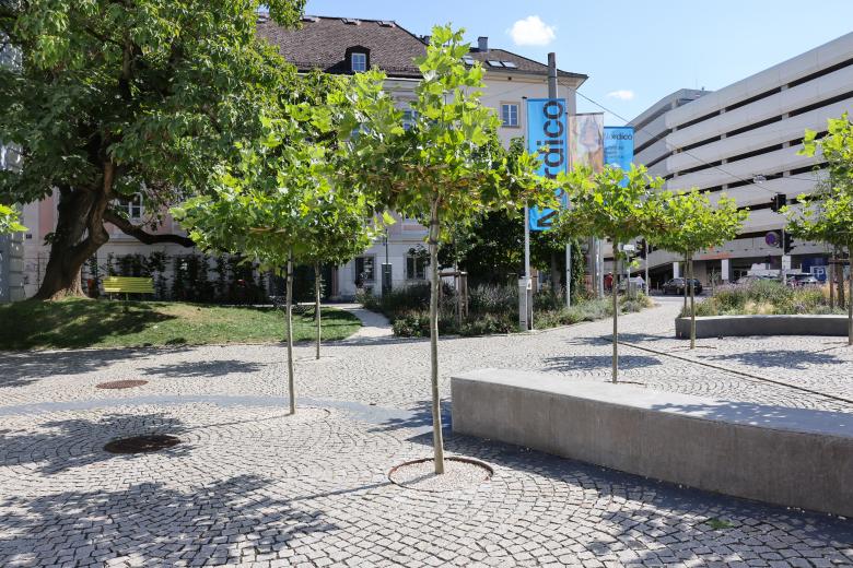 Eine Baumreihe aus Lederhülsenbäumen der Sorte Gleditsia Sunburst zieht sich entlang der Dametzstraße und wertet aus städtebaulicher Sicht den Straßenfreiraum auf. 14 Schirmplatanen kühlen den Platz ab und spenden Schatten für die Sitzskulptur und das Sitzangebot im Gastgarten. Die Schirmplatanen sind besonders für Stadtplätze geeignet, da sie weitgehend