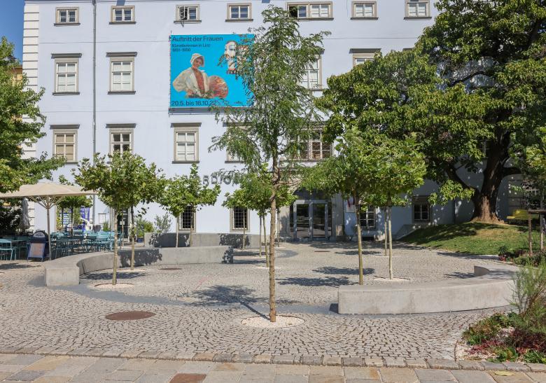 resistent gegen Umwelteinflüsse sind und die Luft sehr gut reinigen. Weitere gepflanzte Bäume, darunter Amberbäume und Magnolien, schaffen im Frühjahr und Herbst besondere Effekte durch Blüten und Laubfärbung und schmücken zusammen mit dem bestehenden Blauglockenbaum den Vorplatz. Dieser Blauglockenbaum ist ein Wahrzeichen und einer der schönsten Bäume, die die Stadt Linz besitzt. Eine Hainbuchenhecke umschließt den Platz räumlich und bietet unter dem Blauglockenbaum Schutz für das Verweilen in der Hängematte.