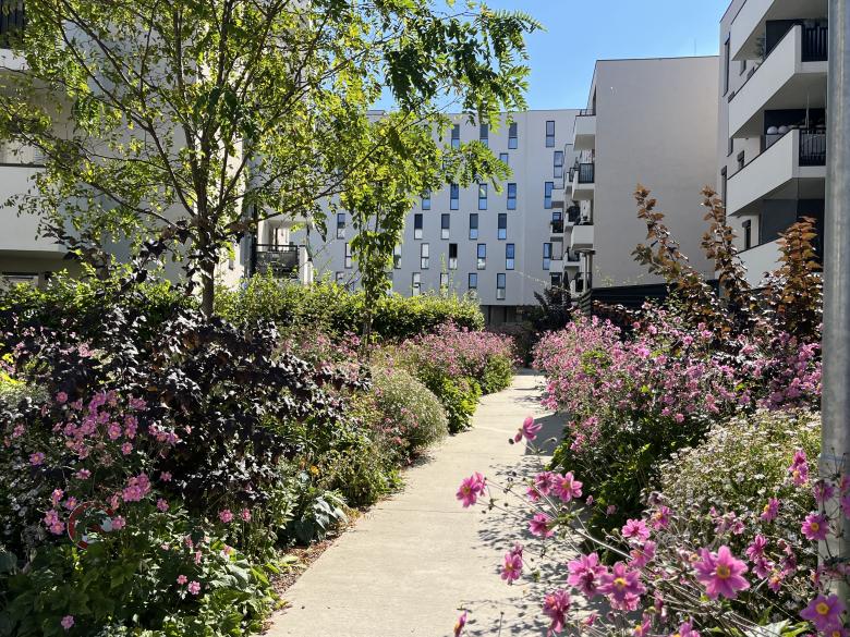 Das Freiraumkonzept der Wohnhausanlage bietet vielfältige Nutzungsmöglichkeiten und umfasst einen Pocket Park, einen Quartiersplatz, einen Siedlungsplatz sowie mehrere Spielplätze. Entlang der Mietergärten und Siedlungswege befinden sich großzügige Grünpufferflächen mit verschiedenen Stauden, Kleingehölzen und Kletterpflanzen. Diese schützen die privaten Gärten und machen das Erscheinungsbild der Anlage unverwechselbar. Die Pflanzenvielfalt sorgt für ein buntes Blütenmeer, einen ökologischen Mehrwert und trägt ebenfalls bedeutend zur Identität der Wohnhausanlage bei. Entlang der Grundstücksgrenzen blühen bunte Hecken, zudem verteilen sich insgesamt 100 Ersatzbäume über die gesamten Freiflächen.