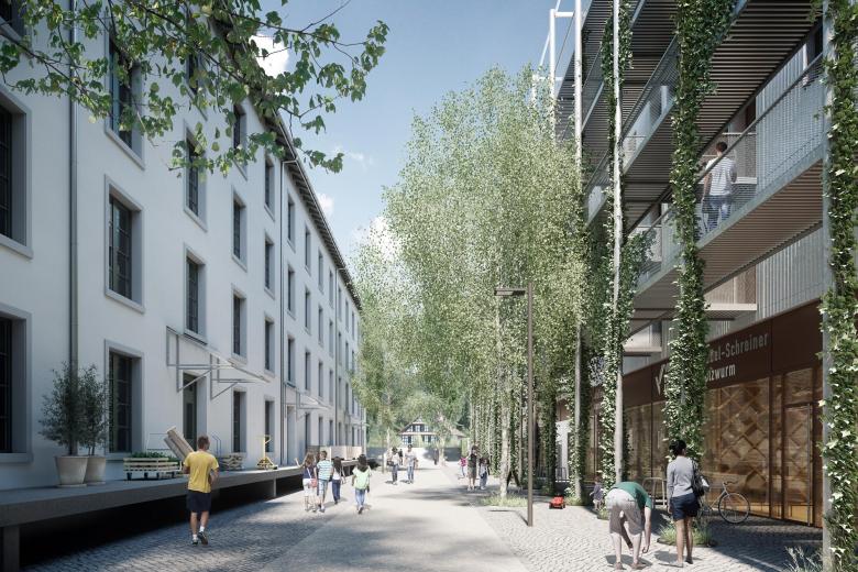 Durch die spielerische Anordnung der Baukörper, deren Ausrichtung vom vorhandenen Siedlungsmuster des verstädterten Dorfes abgeleitet ist, wird das Areal Spinnerei Baar auf mehreren Ebenen mit den umliegenden Quartieren verwebt. Die vorgeschlagene Gebäudetypologie auf der Nordhälfte des Areals vermittelt langgassenseitig zwischen den dörflichen Einzelbauten und dem grossmassstäblichen Spinnereigebäude und bietet nutzungsseitig eine hohe Flexibilität an. Die aufgefächerten Wohnzeilen im südlichen Bereich öffnen den Raum zwischen dem renaturierten Flusslauf der Lorze und dem bewaldeten Hangfuss des Altgutsches. Die neue Passage quer durch den zentralen Mittelbau verbindet die Bereiche Nord und Süd für Fussgänger und Velofahrer auf Platzniveau. Das Denkmal wird an wichtigen Stellen visuell freigespielt. Dominantere Volumen markieren den neuen Henggeler-Platz, den ostseitigen Dorfeingang und das vis-à-vis des Brauereiareals. Der Vorbereich mit Kanal und bestehenden Bäumen lädt zum Flanieren und Verweilen ein. Das geplante Ensemble von lilin architekten bildet die Grundlage für ein neues, lebendiges Quartier auf dem Gelände der Spinnerei an der Lorze.