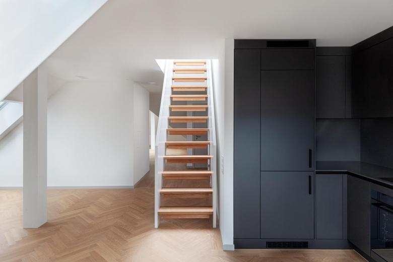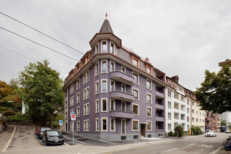 Das markante Wohngebäude mit Türmchen und Mansardendach wurde 1911 als Zweispänner mit grosszügigen Stadtwohnungen erbaut. Mit der anstehenden Sanierung werden die Wohnungen, welche im Zuge des Lifteinbaus 1967 verkleinert wurden, dem aktuellen Wohnungsmarkt angepasst. Der strassenbegleitende Anbau aus Sichtbeton, der Strukturersatz und der Ausbau des oberen Mansardendaches sowie die neue, begehbare Dachzinne vergrössern und verbessern das Wohnflächenangebot.