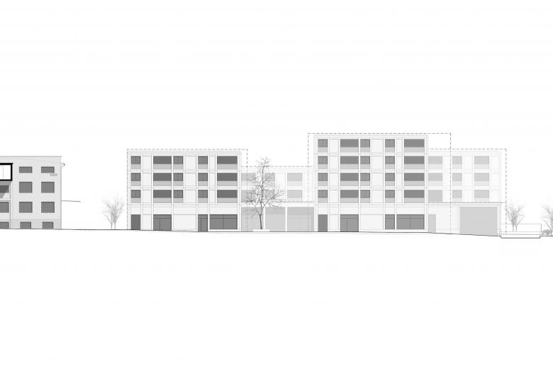 Die erste Phase der Überbauung auf dem Areal der ehemaligen Schreinerei Rüttimann im Ortsteil Siebnen der Gemeinde Galgenen betrifft das Baufeld C, auf dem ein Neubau entsteht. Das Planungsgebiet grenzt im Norden an die stark befahrene Zürcherstrasse an und im Osten an die erhaltenswerte Fassade der Möbelfabrik. Ausgangslage ist der Gestaltungsplan „Rüttimann-Areal Süd“ von lilin architekten. Analog zur Entwicklung und Transformation des im ISOS erwähnten Areals folgt das projektierte Gebäude dem Prinzip der additiven Zusammensetzung von Volumen. Das Ensemble besteht aus vier rechteckigen Gebäuden unterschiedlicher Höhe, jeweils mit drei, vier, oder fünf Vollgeschossen, die versetzt aneinander gereiht werden. Zusätzlich ergänzen eingeschossige Bauvolumen das Ensemble. Geplant ist eine Gewerbenutzung im Erdgeschoss, Wohnnutzung in den Obergeschossen, sowie zwei Untergeschosse mit Einstellhalle, Neben- und Technikräumen. Der Freiraum unterteilt sich in zwei Bereiche: einerseits den Strassenraum, der an die Kantonsstrasse grenzt und welcher mit hartem Belag ausgestattet wird, und andererseits einen Grünraum im Süden, welcher mit Bäumen, Sträuchern, Blumenrasen, Spielwiese und einem Spielplatz als Erholungs- und Begegnungsort für die Bewohner der Siedlung ausgestattet wird.