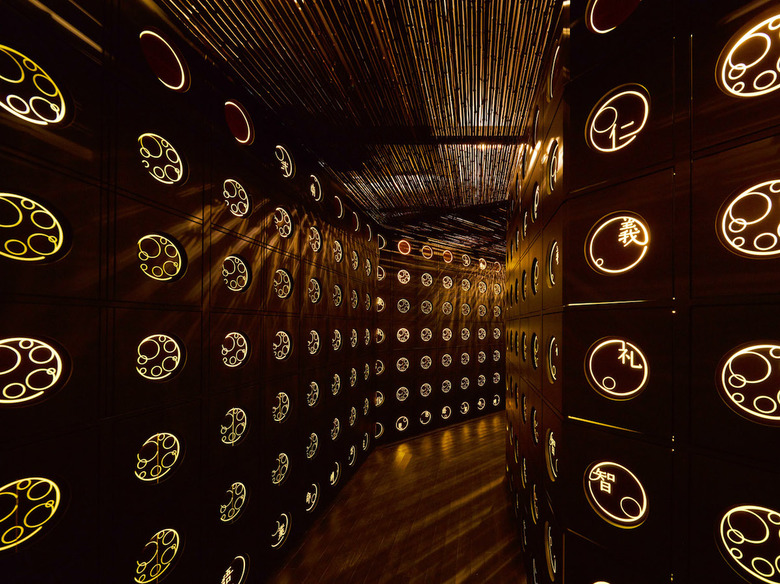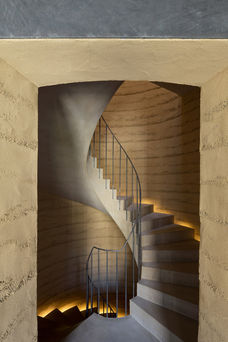 こうして「死」の象徴である納骨堂や墓に対して、そこにに至るまでの参道を「生」の象徴として対置させた。水盤を跨ぐように掛けられた階段は生死を分ける結界として機能する。八角形の納骨堂は宇宙のかたち=冥土そのもので、薄暗いエントランスはその輝度差ゆえ場の変換を意識させ、中心部にある版築の螺旋階段は天空のトップライトが土中を意識させつつ、回転運動の中で内省を促す。辿り着いた納骨室は光る扉が惑星のようで、竹天井隙間からの光が星のように瞬き、宇宙空間を連想させる。ここで故人と対面する。一連の建築的設えは参拝行為の時系列に沿って直接知覚に訴えるように出来ている。