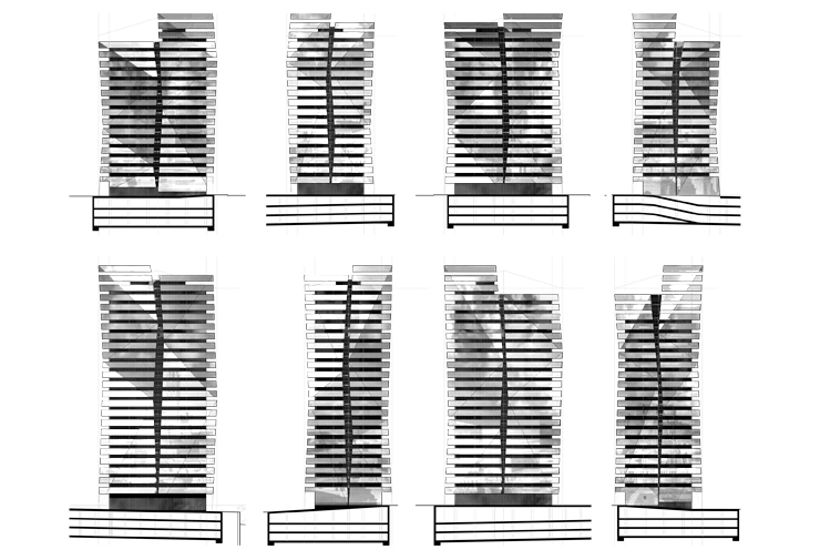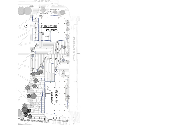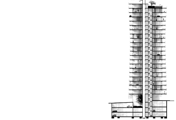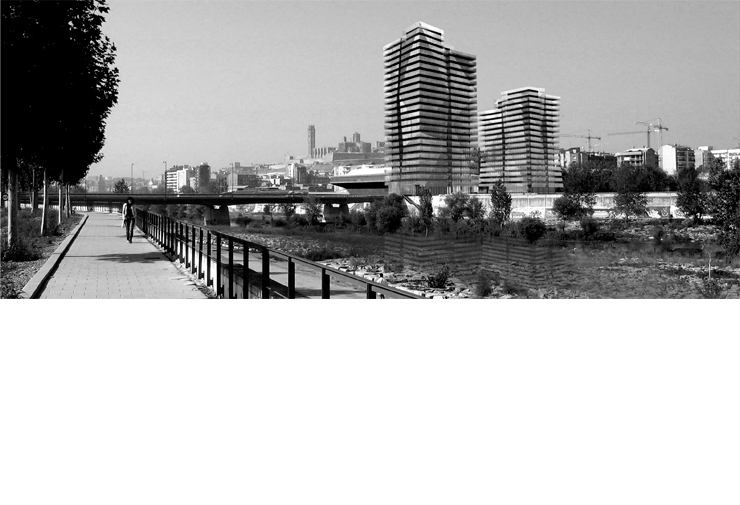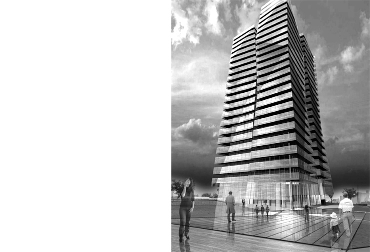 El concurs preveia 27.290,31m2 de sostre sobre rasant a una parcel•la municipal, fent façana amb el Riu Segre i amb el futur edifici del Palau de Congressos de la Llotja. L’avantprojecte s’adequa a la variant de dues torres, una de PB+15 (A) i l’altra de PB+21 (B), prevista com alternativa de regulació a la modificació del Pla General de Lleida. S’aposta per la solució de dos volums verticals per ser la que permet una millor adequació a l’entorn edificat i al paisatge. A més, resulta molt més racional el subministrament de serveis en solucions d’alta densitat. Proposem un tractament de l’espai urbà conjunt i continu amb la urbanització de l’entorn de l’edifici de la Llotja, fent arribar la geometria de la pavimentació fins a la vorera del carrer Baró de Maials. Caldrà, però, a l’arribar a la zona residencial objecte del concurs, introduir un ordre secundari que permeti organitzar els accessos als habitatges, que doti l’àrea de zones d’esbarjo i mobiliari urbà, elements tractats a una escala més humana. Es planteja un accés de serveis per l’avinguda de Tortosa entre el Palau de Congressos i les torres. En aquest punt també es proposa l’accés a l’aparcament, inclòs dins el volum edificat. La torre A es fixa aliniada amb la façana del futur Palau de Congressos, solucionant la continuïtat espaial i urbana de l’avinguda de Tortosa. La torre B es col•loca com a fita d’accés a la ciutat i de relació amb el paisatge, al completar la cantonada del Carrer Baró de Maials amb el mur de Contenció del Riu Segre a l’inici del Pont que el creua. Es formalitza així la imatge més rellevant i suggestiva per a la porta de la ciutat just creuar el riu. Tant la ubicació com l’alçada de l’edificació formaran un punt privilegiat i de referència pel creixement de Lleida. L’envolvent caracteritza la imatge. Les terrasses perimetrals s’interrompen al punt mig de cada façana amb amplades lleugerament diferents a cada planta per tal de formalitzar unes escletxes irregulars i verticals a tota l’alçada, formant quatre unitats formals a cada edifici. Unes lleugeres oscil•lacions dels plans dels voladius, confeccionen la imatge de les dues torres, es pretén que es percebin com a dos conjunts de quatre subtorres cada una, molt més esveltes i de traçat delicat. Les lleugeres oscil•lacions representen una mena de diàleg entre els edificis que el vianant entendrà a través de les infinites siluetes que proposen els perfils dels edificis. El joc de plans triangulars que composen cada façana dóna un ordre que supera l’horitzontalitat de les plantes i aporta la dimensió urbana que es sol•licita en una construcció d’aquestes característiques. Els diferents elements de filtre solar actuen com a reguladors del confort climàtic a la vegada que aporten variabilitat a la façana. El conjunt residencial es planteja amb apartaments d’entre 45 i 75 m2 de 1 i 2 habitacions. Tots disposen d’una amplia terrassa que dóna el component de relació amb l’exterior i esdevé l’element diferenciador d’una torre d’oficines, a la vegada que funciona com a sistema passiu de control ambiental. El concepte diàfan de la distribució plantejada, el confort previst dels interiors, la fàcil accessibilitat, l’amplia urbanització de la base dels habitatges amb una zona de jocs per a infants, la zona comú amb esbarjo i well-ness i la zona comercial o d’oficines a planta baixa, promouen la convivència d’un ampli ventall de ciutadans.